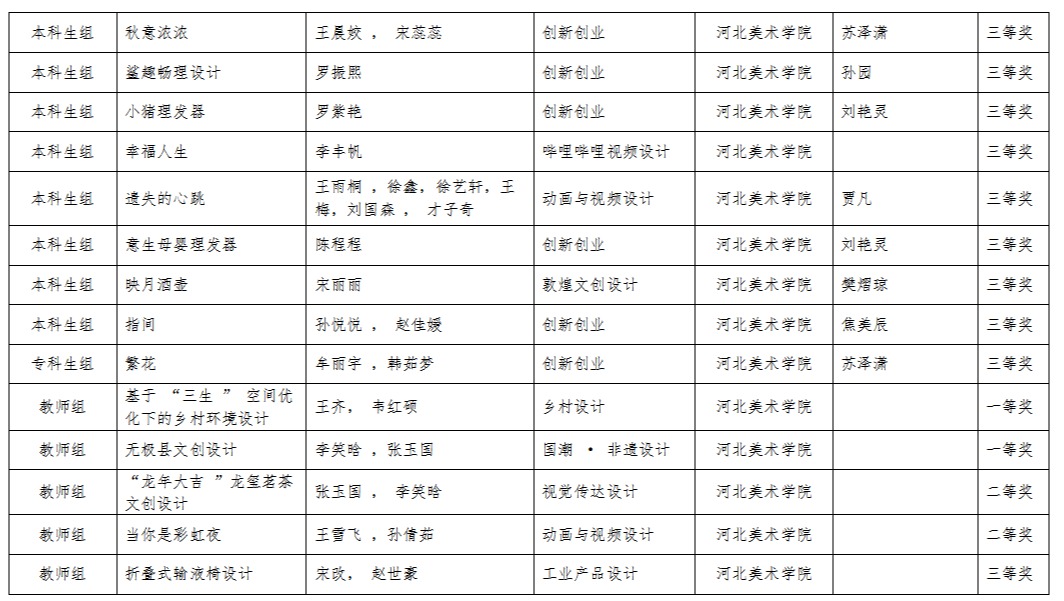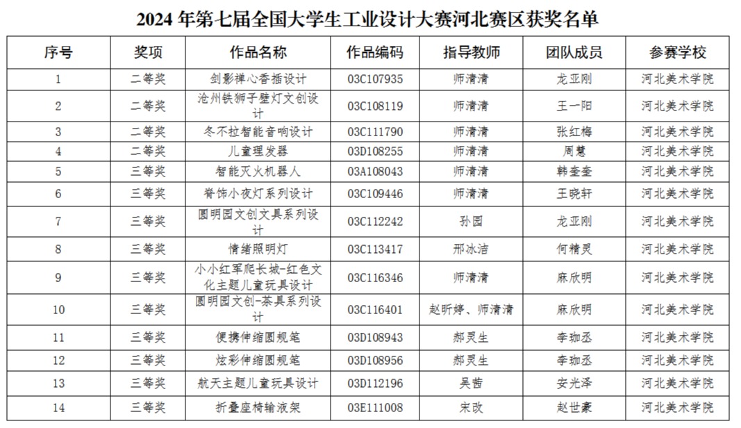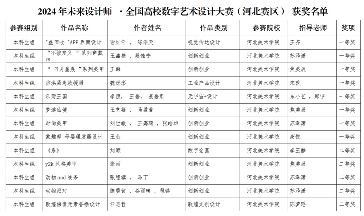 近日,河北省教育厅公布2024年第七届全国大学生工业设计大赛(河北赛区)等赛事活动获奖名单。beat365官网师生在2024年未来设计师·全国高校数字艺术设计大赛(河北赛区)中荣获省级一等奖10项、二等奖13项、三等奖19项,在2024年第七届全国大学生工业设计大赛河北赛区中荣获省级二等奖4项,三等奖10项。