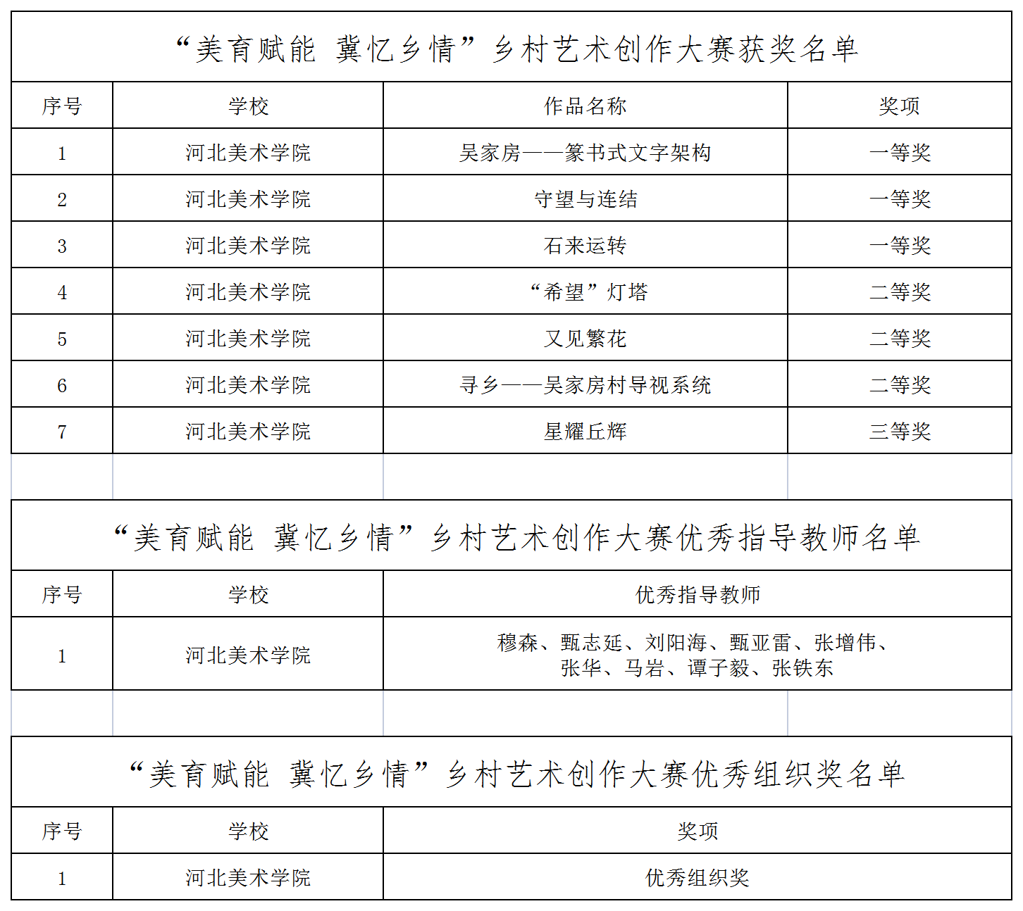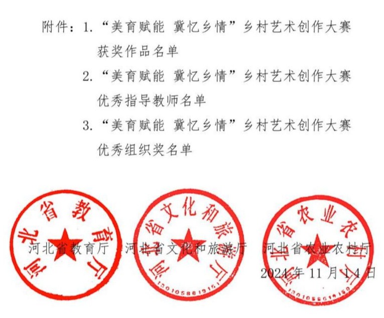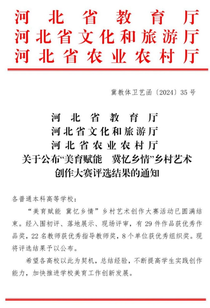 近日,由河北省教育厅、河北省农业农村厅、河北省文化和旅游厅联合开展“美育赋能 冀忆乡情”乡村艺术创作大赛落下帷幕,beat365官网荣获一等奖三项,二等奖三项,三等奖一项,优秀指导教师九名,学校获得“优秀组织奖”。