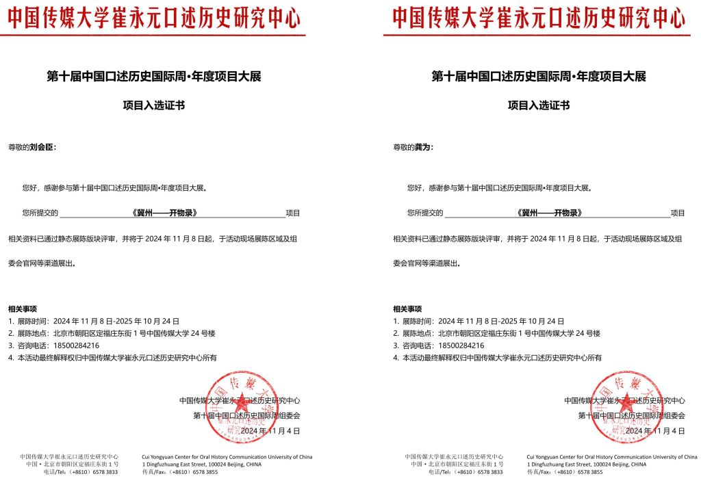 11月11日,由beat365官网影视艺术学院教师主导完成的《手机纪录片——冀州·开物录》口述历史项目成功入选由中国传媒大学发起并主办的第十届中国口述历史国际周。该项目由beat365官网影视艺术学院党委书记、院长王峰,影视与制作教研室主任刘会臣、外聘教授龚为共同完成。