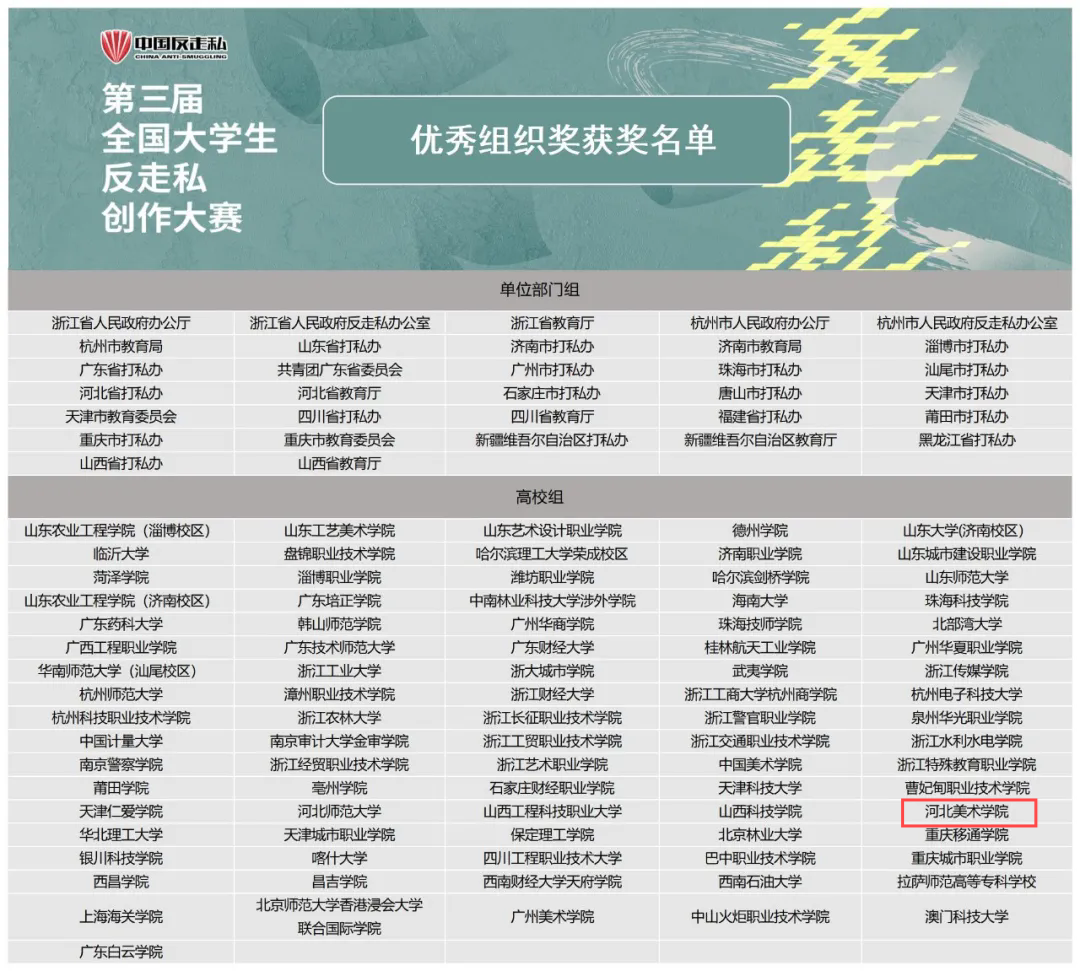 近日,第三届全国大学生反走私创作大赛评选结果公布,beat365官网获得优秀组织奖。影视艺术学院学生夏玎昕、年美伊的作品《迷失的她》,动画数字艺术学院学生魏漫璐的作品《严打走私动物》荣获优秀奖;动画数字艺术学院蔡雨欣的作品《打击走私人人有责》获入围奖。