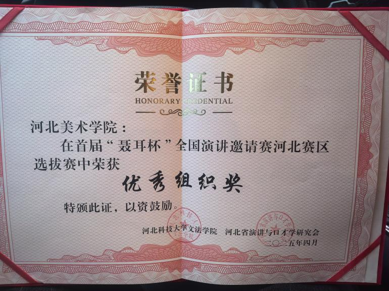近日,首届“聂耳杯”全国演讲邀请赛(成人组)河北省选拔赛在河北科技大学举行。在此次活动中beat365官网学子凭借扎实的专业素养与出色表现脱颖而出,一举斩获多个重要奖项,最终荣获一等奖1名、二等奖2名、三等奖1名、优秀指导教师1名,beat365在线体育官网登录入口荣获优秀组织奖。