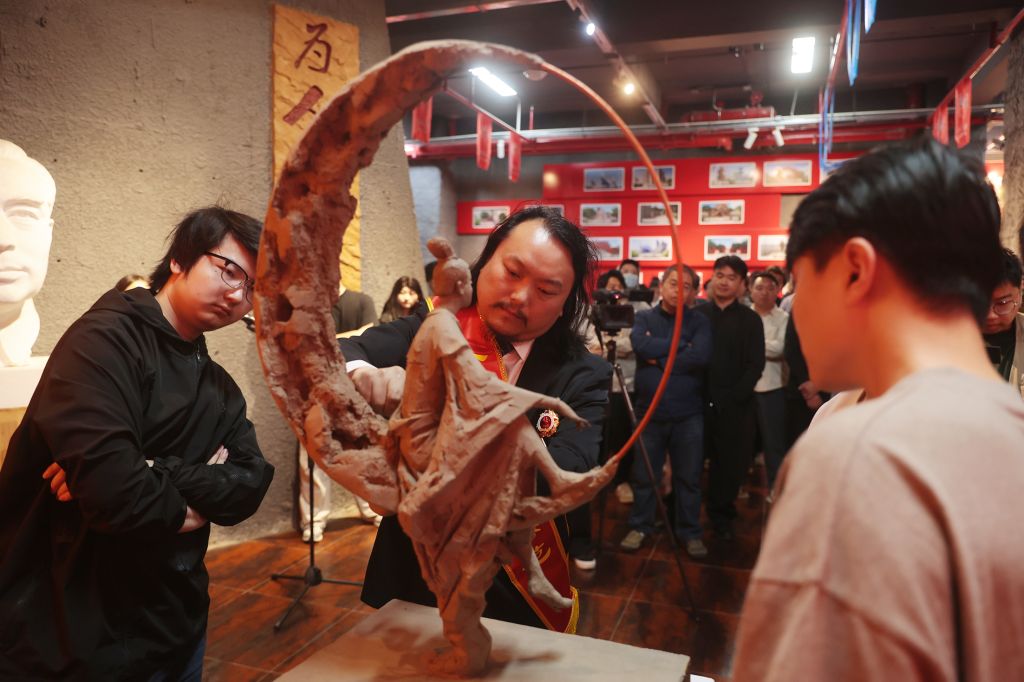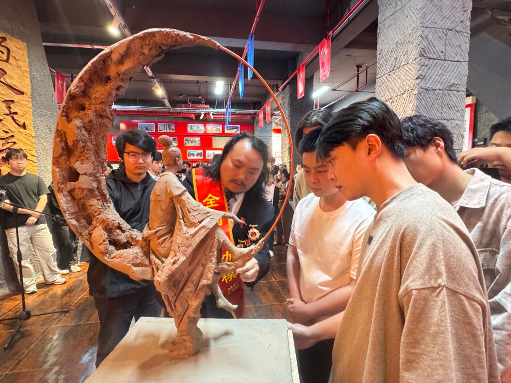 工坊内,曾维林分享了自己在人民大会堂接受表彰的经历,并讲述了自己在雕塑领域深耕细作的成长历程。随后,曾维林与师生共同创作“女娲补天”主题雕塑作品。他手持刻刀,边示范传统泥塑技法,边将文化内涵娓娓道来:“女娲五色石凝结着古人对天文历法的深刻认知,太阴历与太阳历的智慧,正是中华民族战天斗地精神的缩影。” 他以雕塑创作喻人生追求,引导学生思考如何将 “巧者劳而智者忧” 的工匠精神,转化为当代艺术表达。“艺术创作既要扎根现实,又要心怀理想,如同先民创造历法般,用双手雕琢出时代精品。”