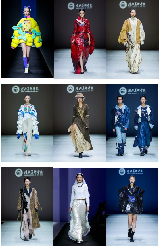 本次毕业设计以“经纬共生·燕潮鸣”为主题,将文化与空间经纬交织,唤醒燕赵大地的设计活力。29名毕业生参与其中,共发布了66套服装作品。“经纬”贯穿设计,既是地理与文化的交织符号,也构建了服装结构的秩序感。通过面料的经纬交错、图案的纵横排列,展现理性之美,同时象征着传统与现代、本土与国际的融合探索。“燕”承载着燕赵的文化底蕴,我们从当地古建筑、民俗文化中提取传统元素,结合传统技艺,转化为剪裁线条与刺绣图案,赋予古老符号新的生命力,彰显了突破传统的创新精神。“潮”代表时代与生命活力,以创新思维重构传统文化基因,实现传统元素与前沿理念的跨界共生,让文化在时尚潮流中焕发新生。