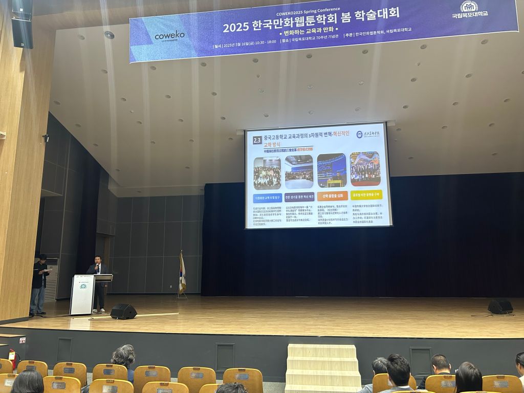 5月16日,考察团访问木浦大学并出席韩国网络漫画学术研讨会。张建敏致开幕辞。他对韩国网络漫画学术研讨会的成功举办表示热烈祝贺,并指出网络漫画作为新兴的文化产业形式,近年来在全球范围内迅速崛起,已成为文化传播与艺术创作的重要载体。姜仁峰以《中国高校漫画专业教育体系演进研究》为题,进行了主旨演讲。双方在交流中碰撞出思想火花,为网络漫画的未来发展提供了新的思路与方向。下午,两校签订MOU合作协议,在学术交流、人才培养、资源共建等方面达成战略共识。随后,校方邀请考察团参观多林画廊专题展览,通过观摩韩国当代艺术家作品,进一步拓展国际艺术认知维度。