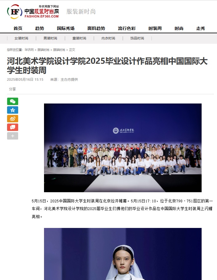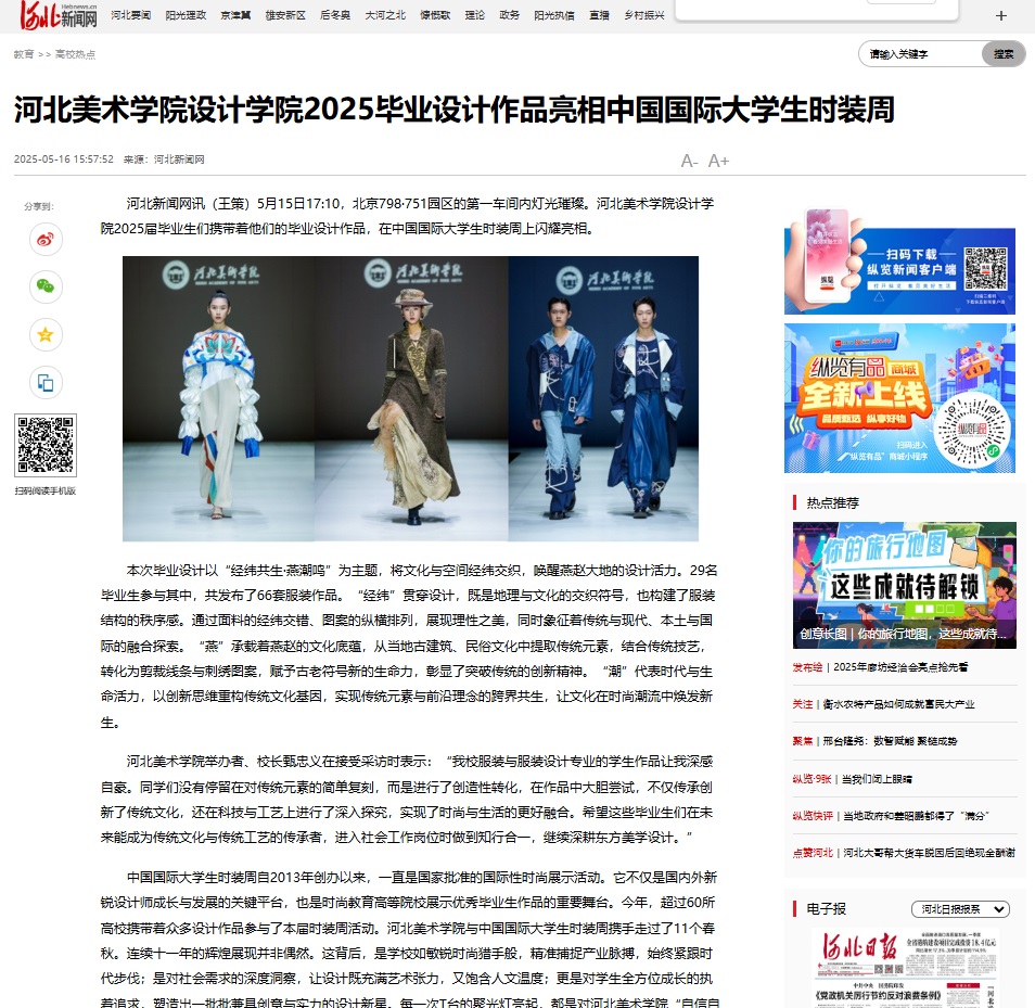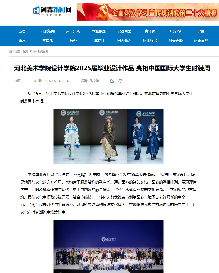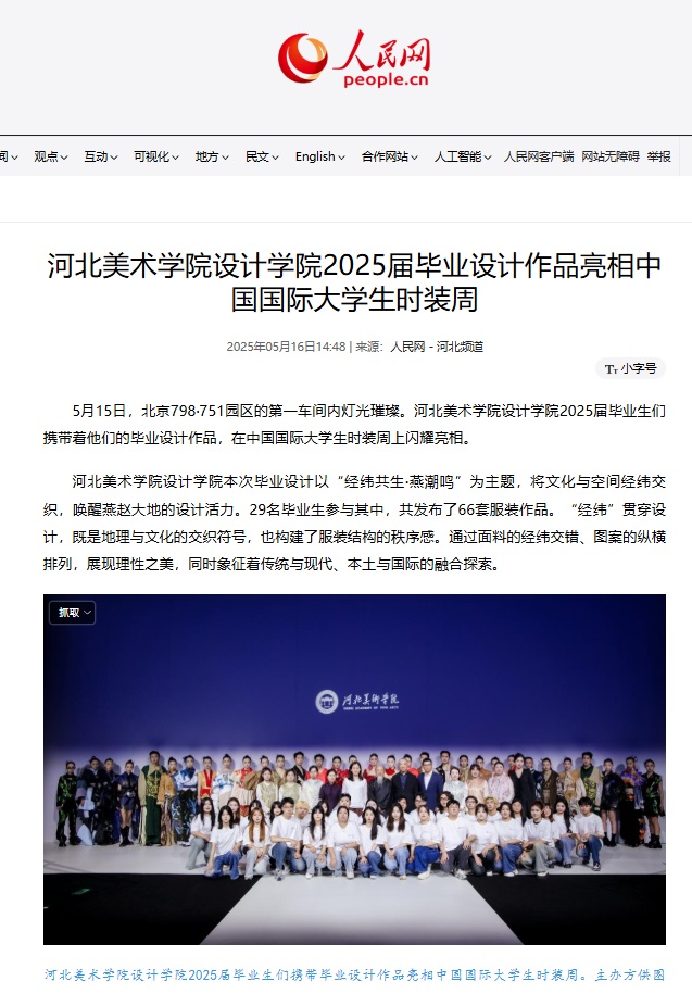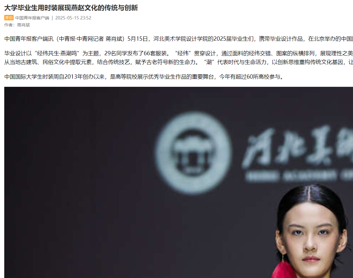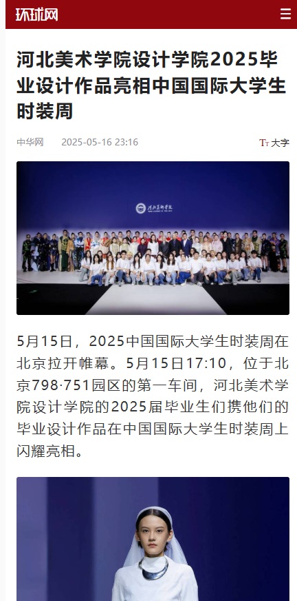 5月15日,beat365官网设计学院2025届毕业设计作品亮相中国国际大学生时装周,受到人民网、凤凰网、中国教育报、中国青年报、央视频、中华网等30余家媒体的广泛关注和报道。