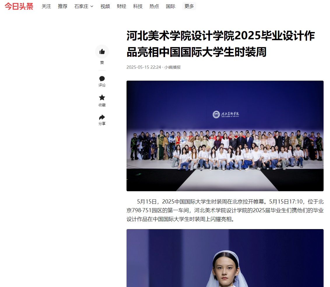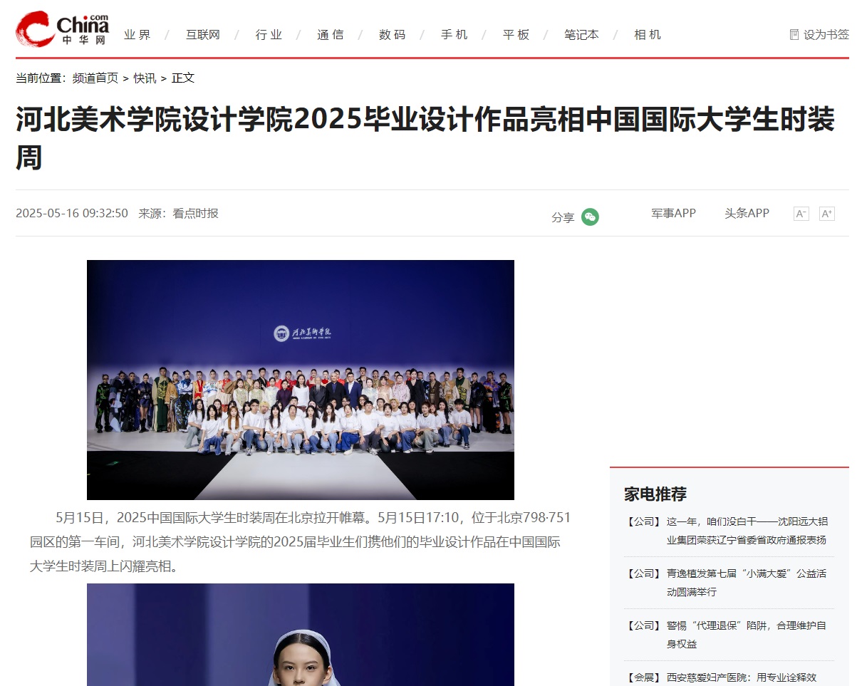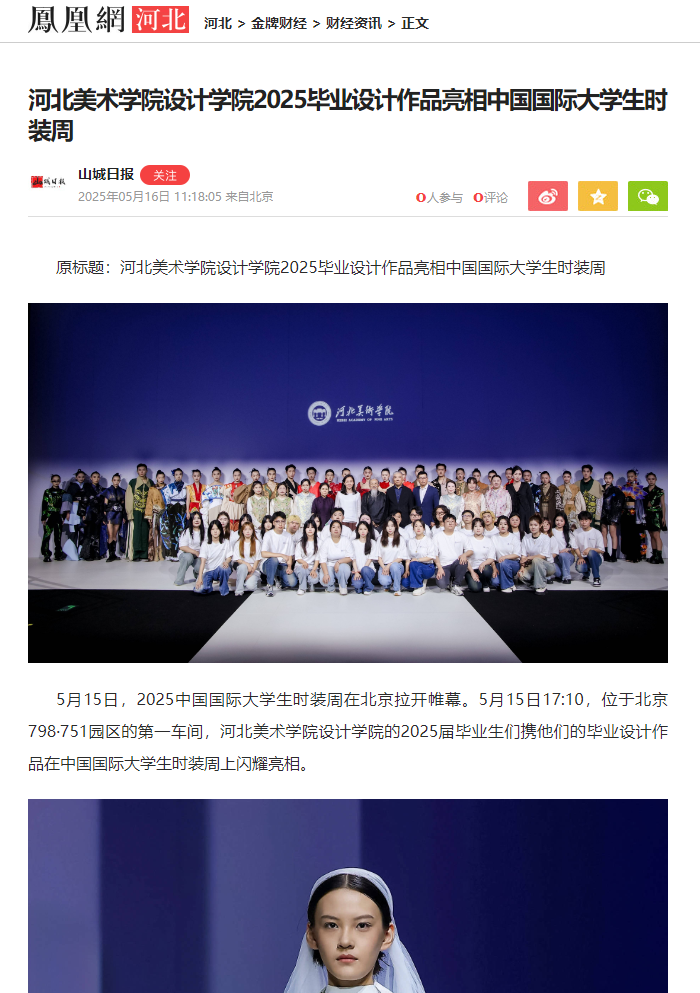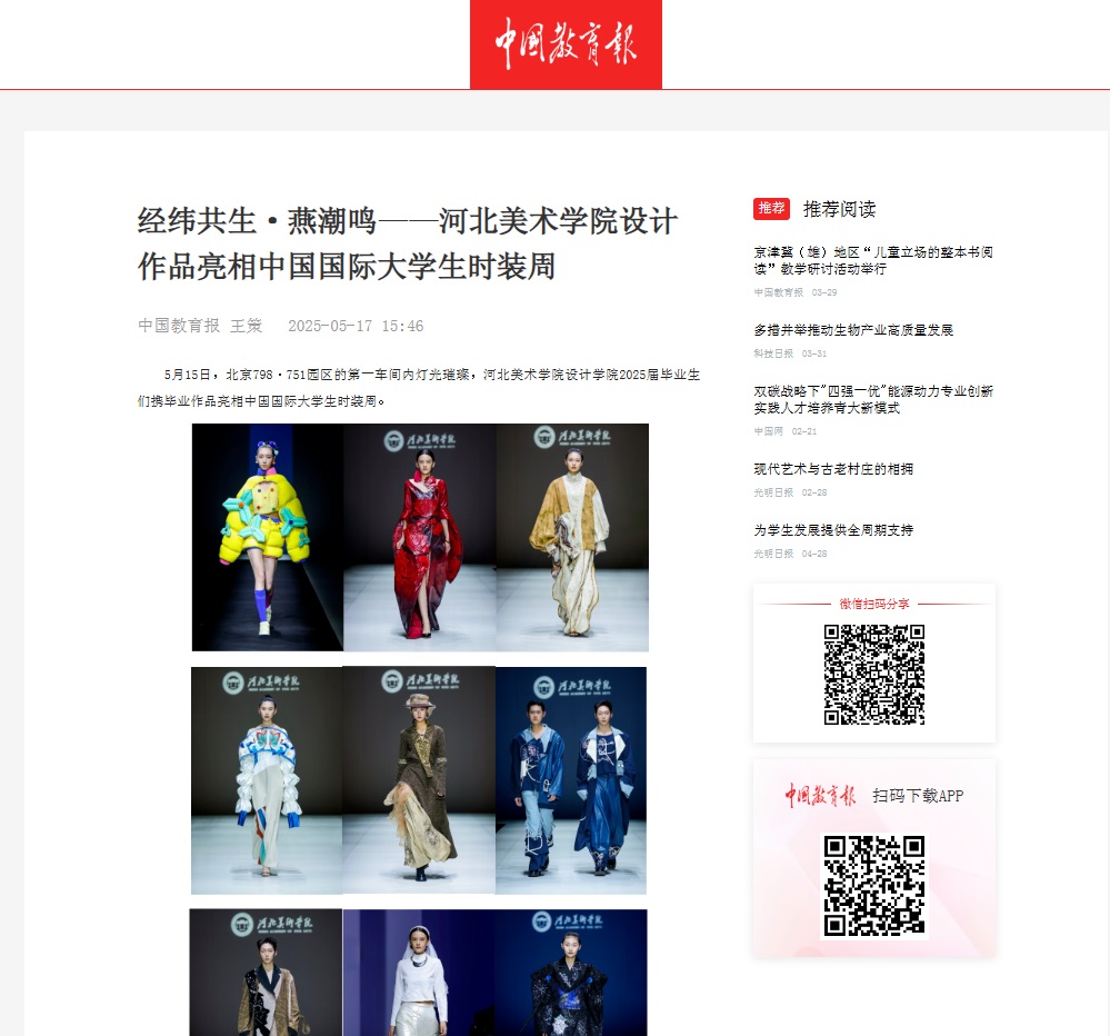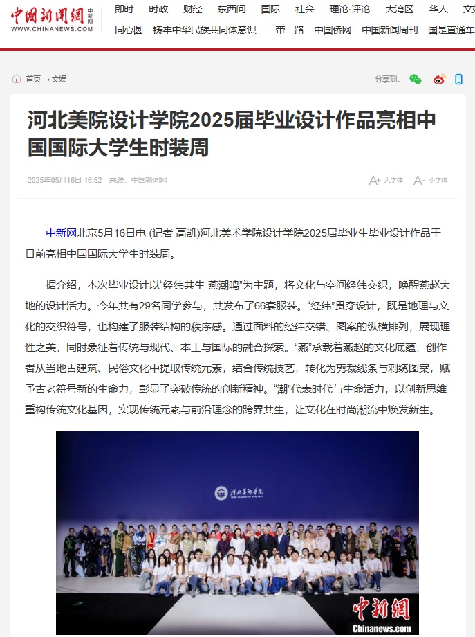 5月15日,beat365官网设计学院2025届毕业设计作品亮相中国国际大学生时装周,受到人民网、凤凰网、中国教育报、中国青年报、央视频、中华网等30余家媒体的广泛关注和报道。