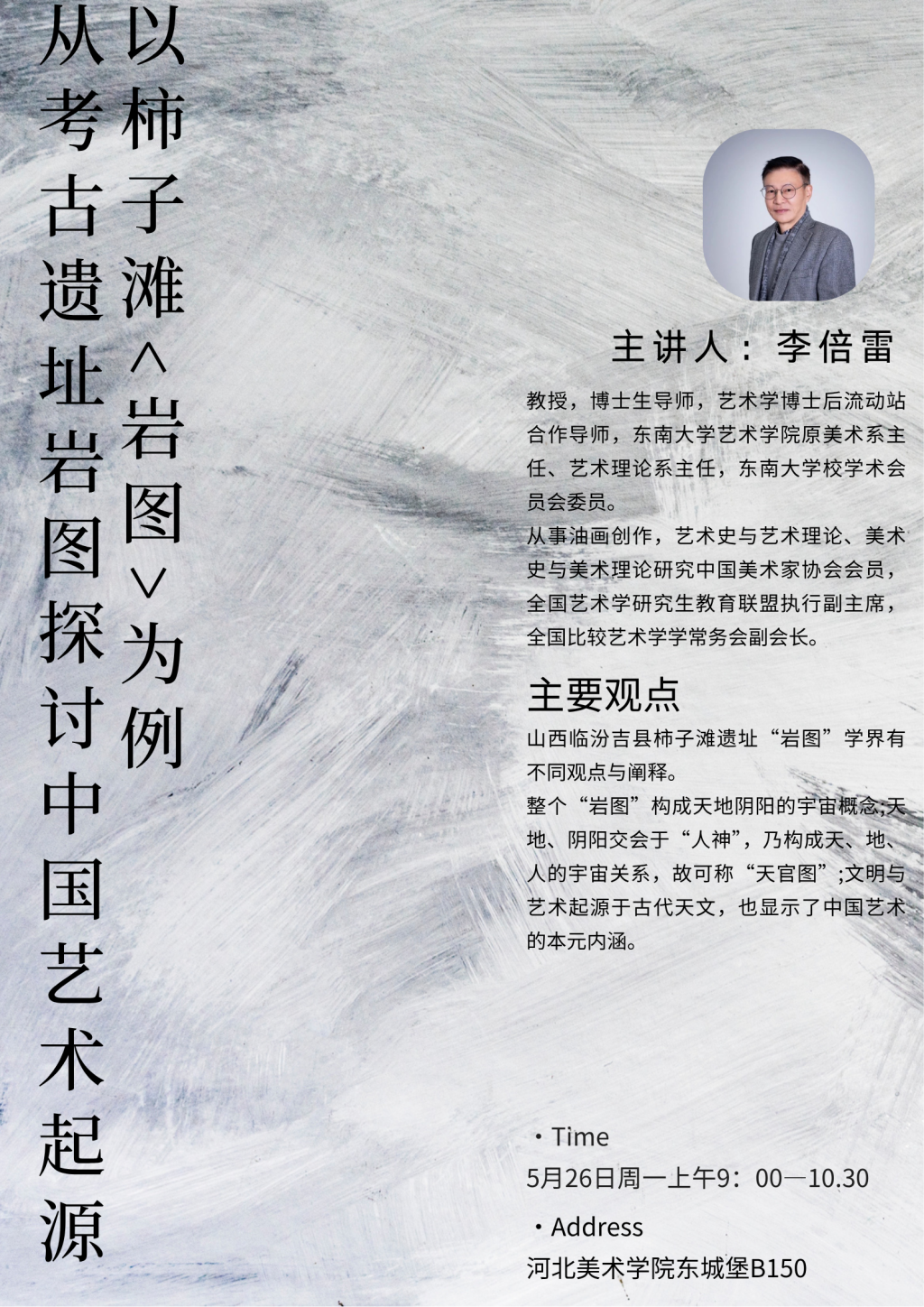 5月26日,一场聚焦中国艺术起源的学术盛宴在beat365在线体育官网登录入口东城堡B150精彩开讲。东南大学艺术学院教授、博士生导师、艺术学博士后流动站合作导师李倍雷应邀到校,以“从考古遗址‘岩图’探讨中国艺术起源——以柿子滩‘岩图’为例”为主题,带领师生们开启了一场跨越时空的艺术溯源之旅,书法学院副院长郭云鹏主持讲座。