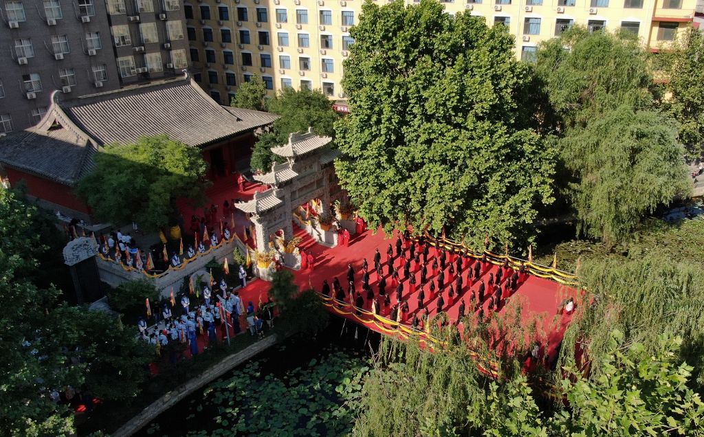 汉帜飞扬,鼓乐齐奏。上午8时30分,钟鸣和“启户”声响起,朱门大开,六十四舞者执羽而入,八佾舞翩跹舒展。众师生身着汉服,缓步行至殿前,庄重而立。