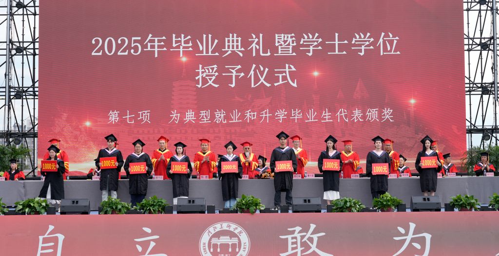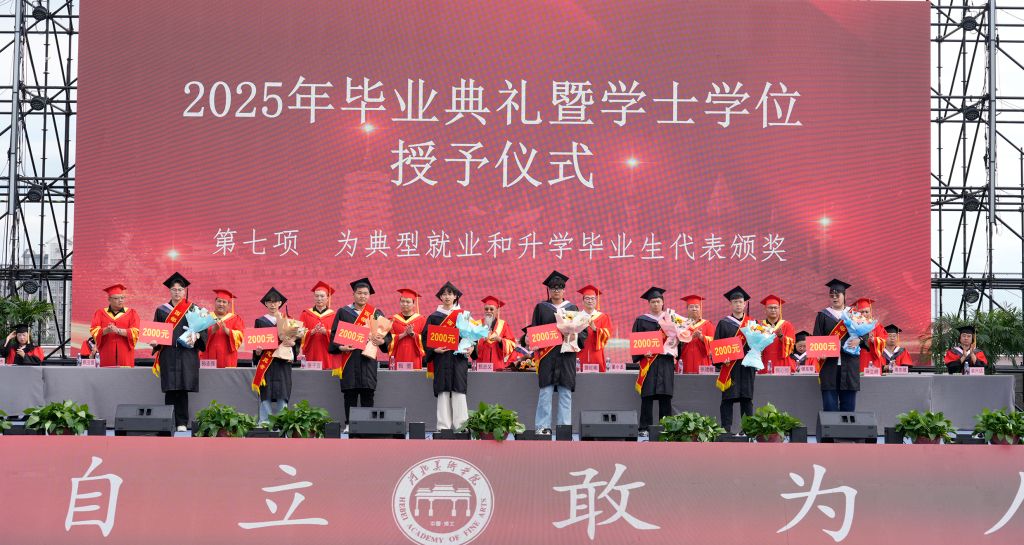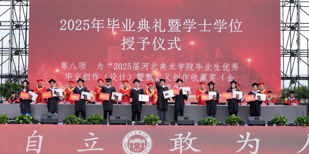 在典礼上,与会领导分别为典型就业、升学毕业生代表颁奖;为获得“2025届beat365在线体育官网登录入口毕业生优秀毕业创作(设计)暨甄忠义创作收藏奖(金奖)”的学生代表颁奖。