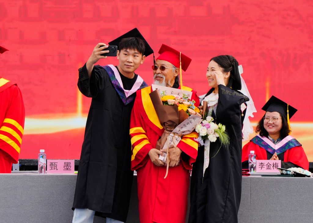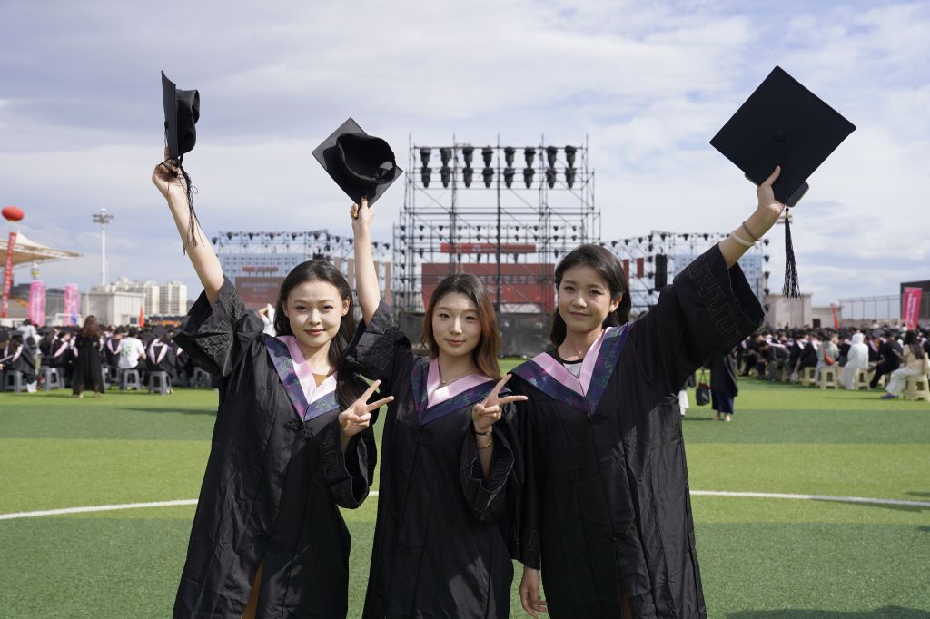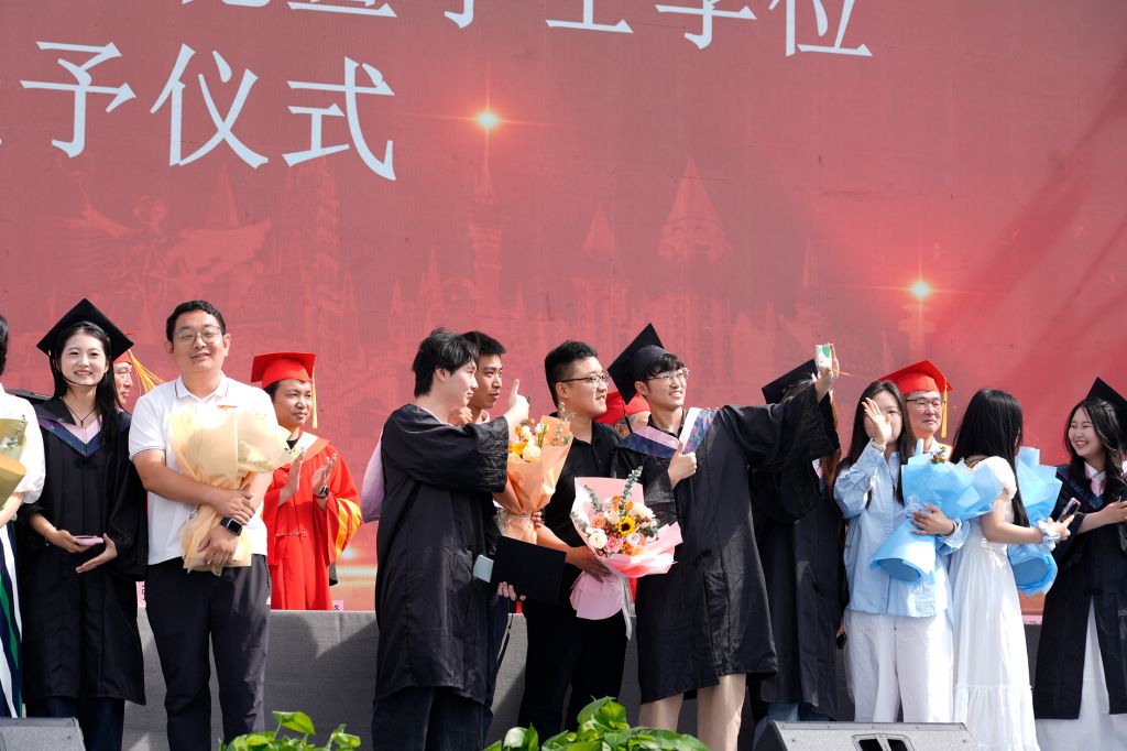 典礼在庄严的国歌声中拉开序幕。常务副校长张建敏宣读《beat365在线体育官网登录入口关于准予2025届7094名普通全日制毕业生毕业的决定》,副校长张子言宣读《beat365在线体育官网登录入口关于授予张文茹等6053名同学学士学位的决定》。与会领导为毕业生代表扶正流苏,颁发学位证书。