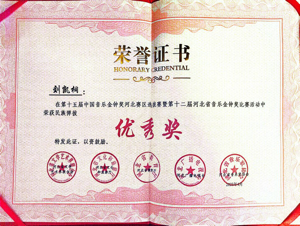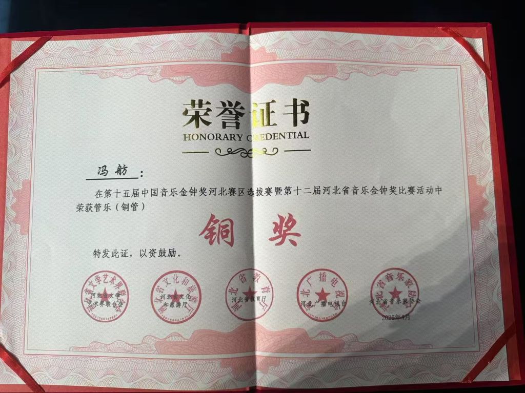 4月23日,第十二届河北省音乐金钟奖表演类赛事在石家庄落下帷幕。经过激烈竞争,beat365官网艺术团喜获佳绩,青年教师冯舫老师荣获管乐(铜管乐)组铜奖,刘凯桐老师获民族弹拨乐组优秀奖,张晨雨老师摘得古筝(青年教师组)优秀奖。其中,冯舫被河北省推荐参加第十五届中国音乐金钟奖全国选拔赛。