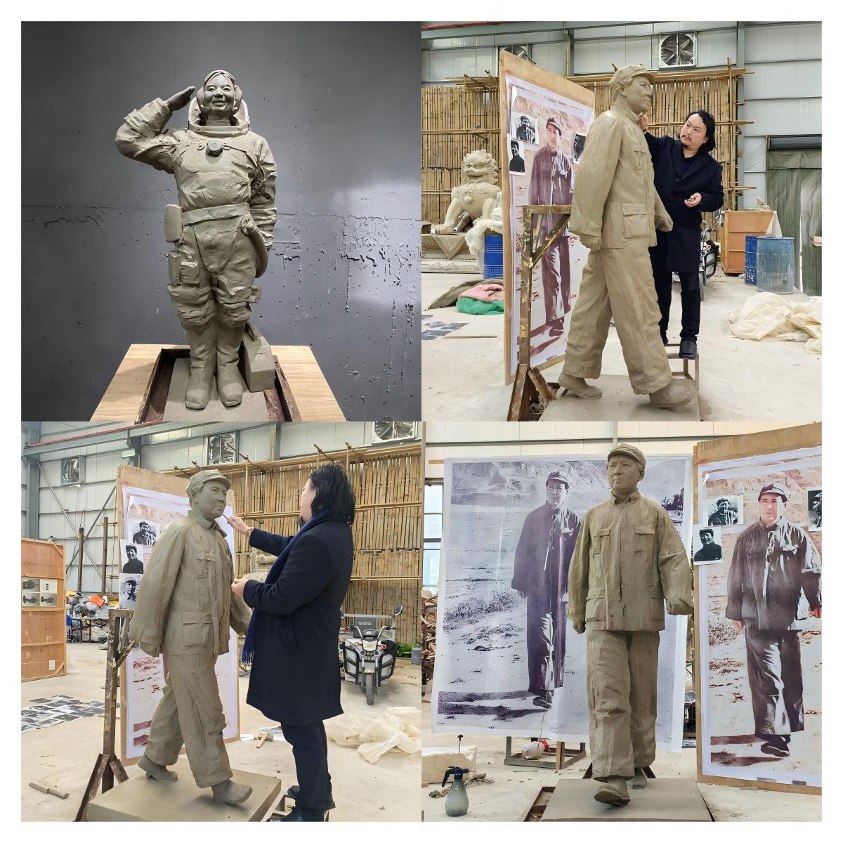 雕塑院直属党支部以“铭记党史,传承精神”为主题创作红色雕塑,推出“毛主席在延安”和“筑梦航天”两组作品。前者深挖延安时期历史细节,精准呈现伟人形象;后者融入火箭、宇航员等元素,以现代材料诠释航天精神,用雕塑语言讲述党的百年征程。