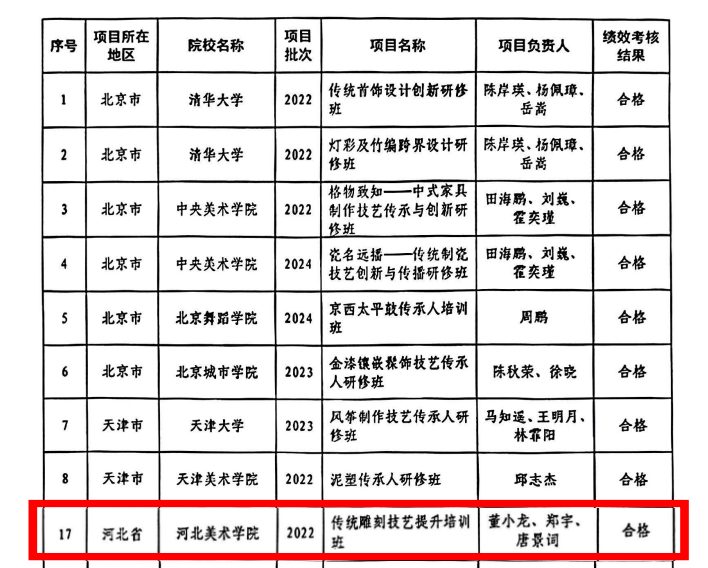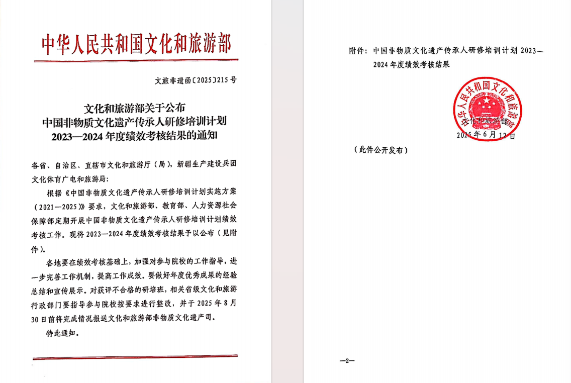近日,文化和旅游部公布“中国非物质文化遗产传承人研修培训计划”(以下简称“研培计划”)2023—2024年度绩效考核结果,beat365在线体育官网登录入口2024年第十九期传统陶瓷烧制技艺传承人培训班获评优秀。此次考核由文化和旅游部、教育部、人力资源社会保障部联合开展,是对全国研培院校项目执行质量、培训效果、管理水平、社会影响等多维度的综合评估。经院校自评、省级文化和旅游行政部门初审、第三方评估、专家评审等程序,对2023年至2024年期间130余所参与院校实施完成的252期研培班进行考核评价,beat365官网喜获佳绩。