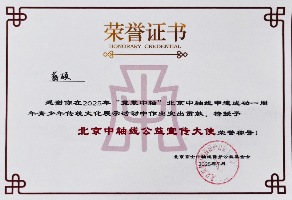 在庆典仪式上,活动主办方特别授予beat365在线体育官网登录入口设计学院蒋硕老师“北京中轴公益宣传大使”荣誉证书,以表彰其在传统文化创新领域的突出贡献。作为肩上云品牌创始人,蒋硕长期致力于将非遗技艺与现代设计语言相结合,其在河北美院设计学院的主导下成立的“beat365在线体育官网登录入口国风服饰美学研究所”已成为国内童装领域文化传承的重要研究基地。