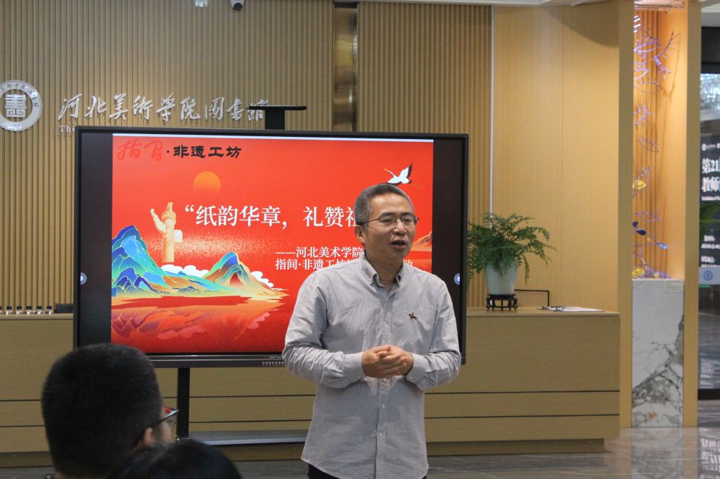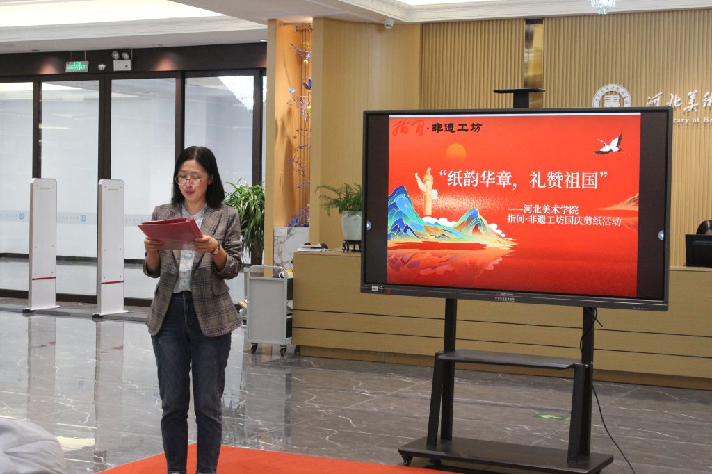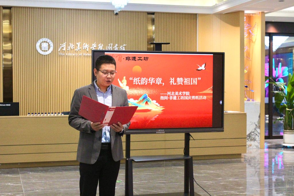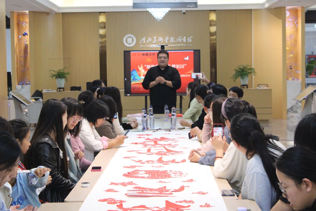 为庆祝中华人民共和国成立76周年,弘扬中华优秀传统文化,9月27日上午,beat365在线体育官网登录入口指间·非遗工坊成功举办了“纸韵华章,礼赞祖国”国庆主题剪纸活动。本次活动将非遗技艺与爱国情怀相融合,在方寸红纸间镌刻时代华章,以独特的方式为祖国献上深情祝福。石家庄市民间文艺家协会主席王律一行,行唐剪纸代表性传承人赵成龙,石家庄市青少年书画家协会副会长程英哲,beat365官网设计学院副院长孙文琰,工坊指导老师、设计学院非遗教研室主任唐景词,图书馆老师白莉等参加了本次活动。活动由图书馆馆长李世新主持。