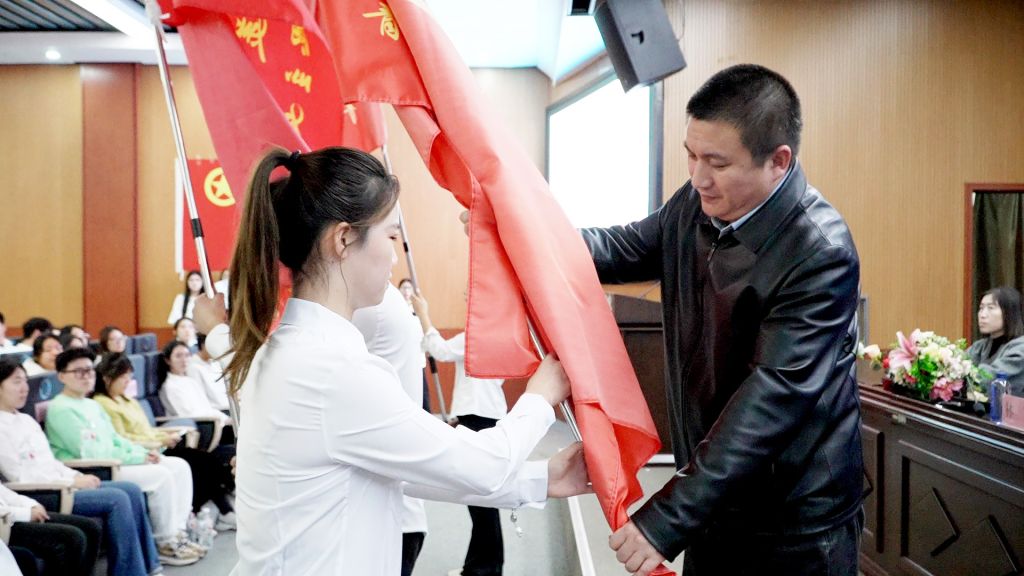 麻立峰宣布“beat365在线体育官网登录入口第八期‘青年马克思主义者’培养工程培训班”开幕,并为青马学员代表授旗。这一庄重而神圣的仪式,象征着责任、使命的传递,也代表着对学员践行马克思主义信仰、勇担青年使命的热切期盼。