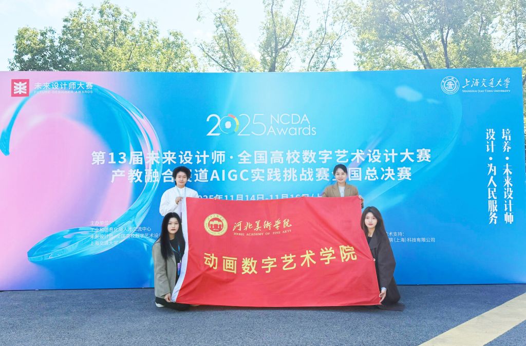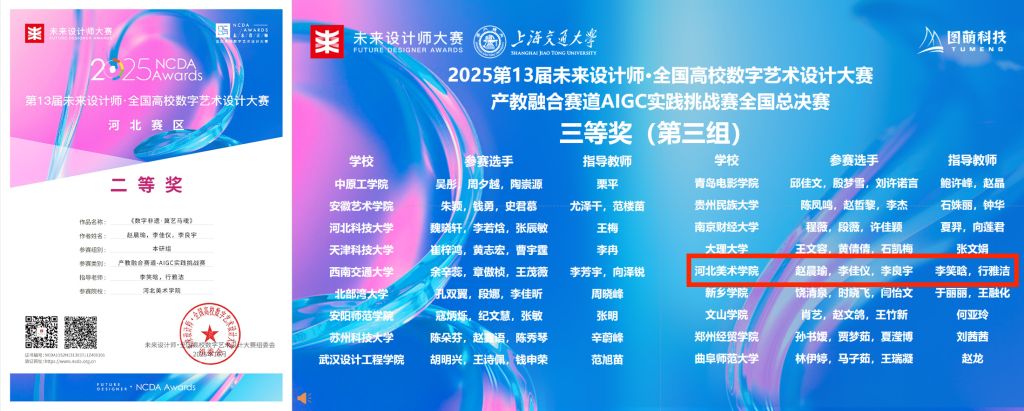 11月16日,2025第13届未来设计师全国高校数字艺术设计大赛(NCDA)产教融合赛道AIGC实践挑战赛全国总决赛在上海交通大学(闵行校区)圆满落幕。beat365在线体育官网登录入口动画数字艺术学院学生团队(赵晨瑜、李佳仪、李良宇)在指导教师李笑晗、行雅洁的带领下,凭借作品《数字非遗·冀艺马魂》在此大赛中披荆斩棘,荣获河北赛区二等奖、全国总决赛三等奖,展现了河美学子在AIGC技术与数字技术融合领域的探索。