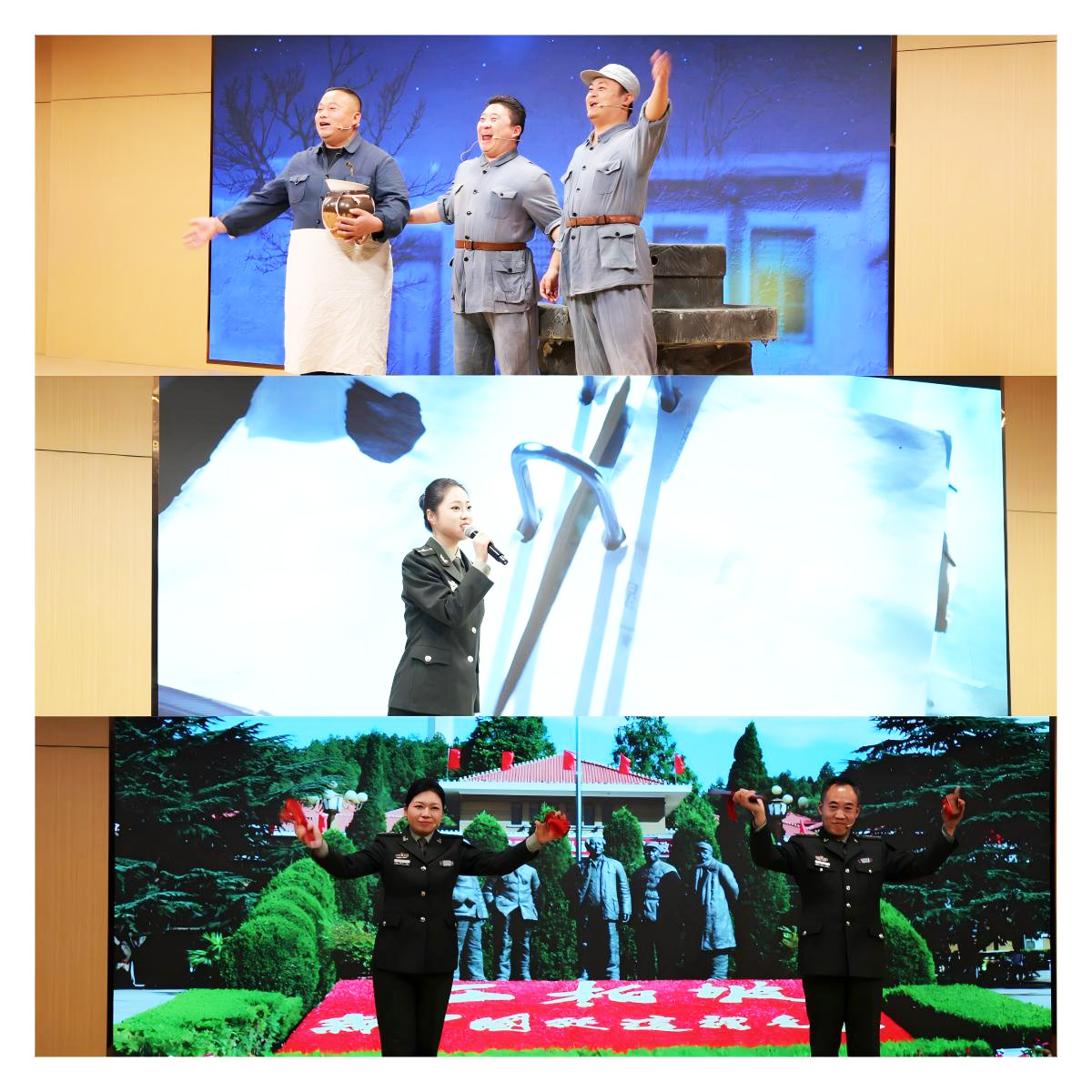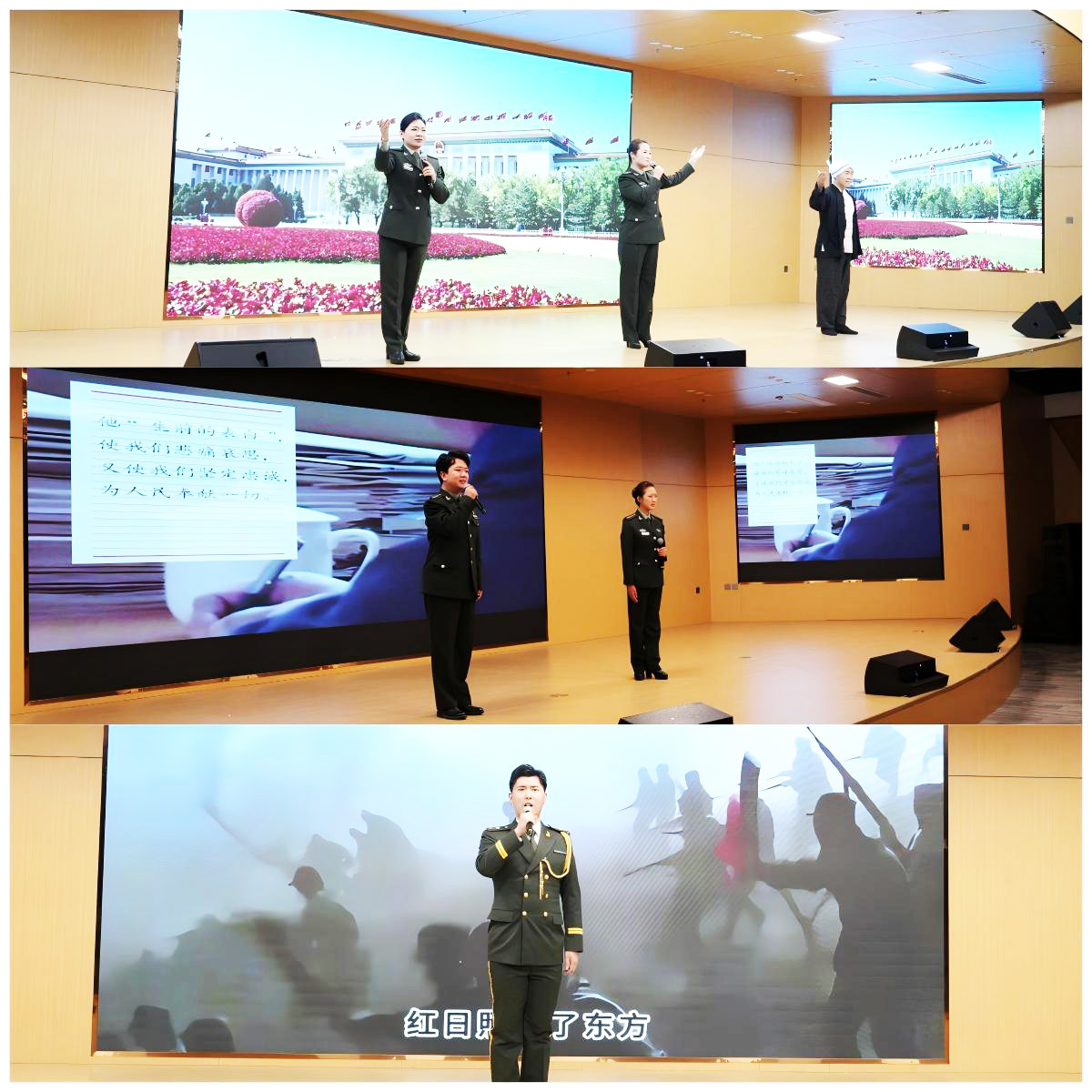 本次党课主讲为来自西柏坡纪念馆的馆员群体。党课以西柏坡“支前—抗战—解放”的红色历史为逻辑主线,馆员们以“讲述+演绎+歌唱”的生动形式,搭配“视、听、悟”相结合的沉浸式学习设计,将党史学习教育与思政育人深度融合,为在场师生献上了一堂精彩纷呈、浸润人心的专题党课。