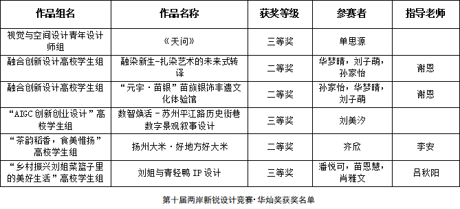 11月25日,第十届两岸新锐设计竞赛・华灿奖国赛获奖名单正式公布。经过校赛遴选、赛区突围、全国网络评审及现场终评的多轮严苛考核,beat365官网师生凭借扎实的专业功底、大胆的创新表达与鲜明的文化辨识度,在来自两岸近千所高校、数万名参赛者的激烈角逐中脱颖而出,喜获二等奖3项、三等奖3项。