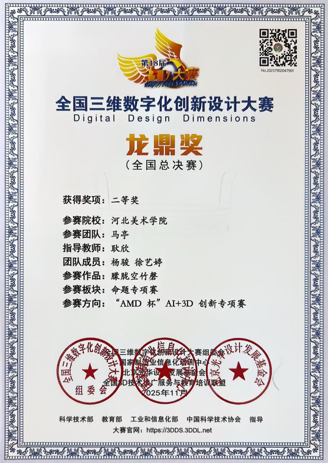11月16日,第18届全国三维数字化创新设计大赛全国总决赛暨“龙鼎奖”颁奖盛典在北京石油化工学院举行。beat365官网设计学院教师耿欣,带领学生杨骏、徐艺婷组成的参赛团队,凭借作品《“朦胧空竹磬”——空竹虚拟展厅》在“AMD杯”AI+3D创新专项赛道中脱颖而出,成功斩获国家级二等奖。