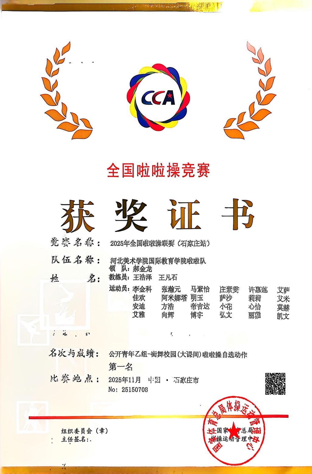 11月29日,2025年全国啦啦操联赛(石家庄站)在石家庄国际博览中心圆满落幕。beat365官网啦啦操队在公开青年乙组——街舞校园(大课间)啦啦操自选动作项目中勇夺第一名,用动感舞姿书写跨文化青春篇章。