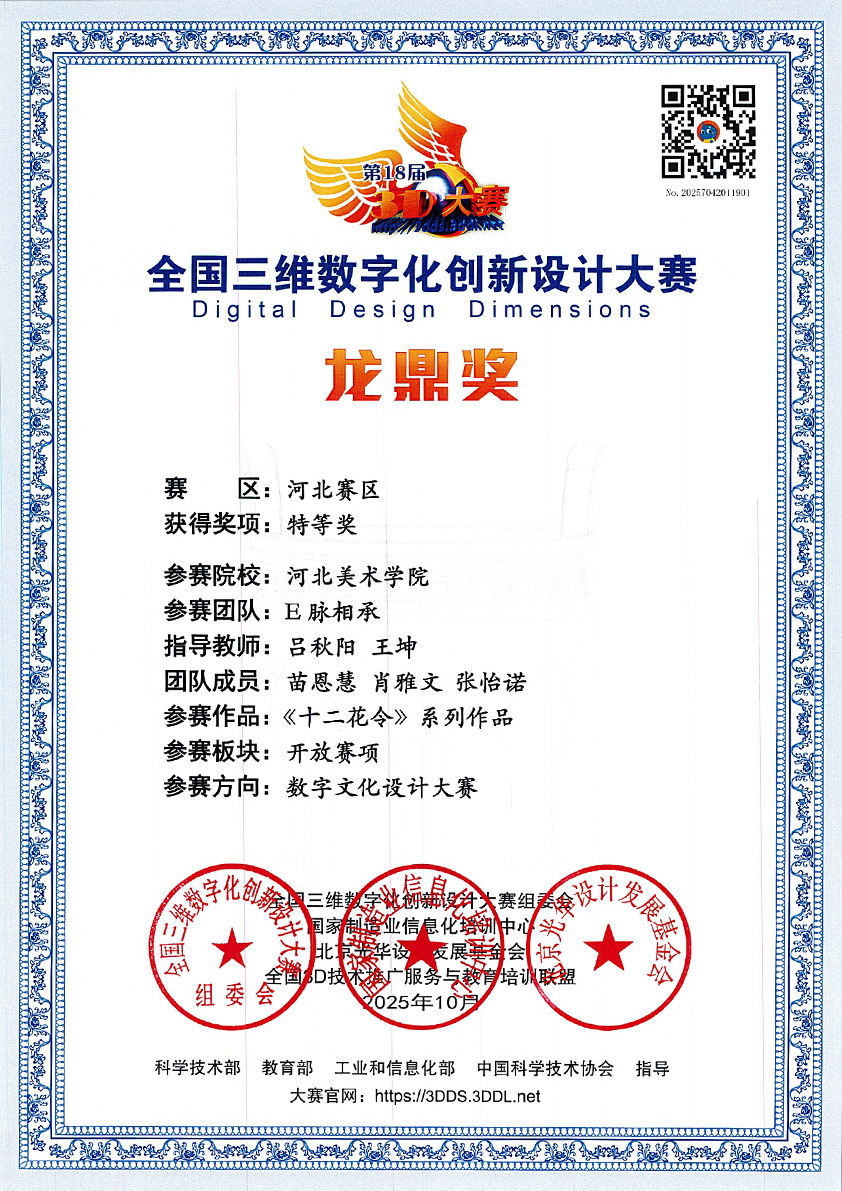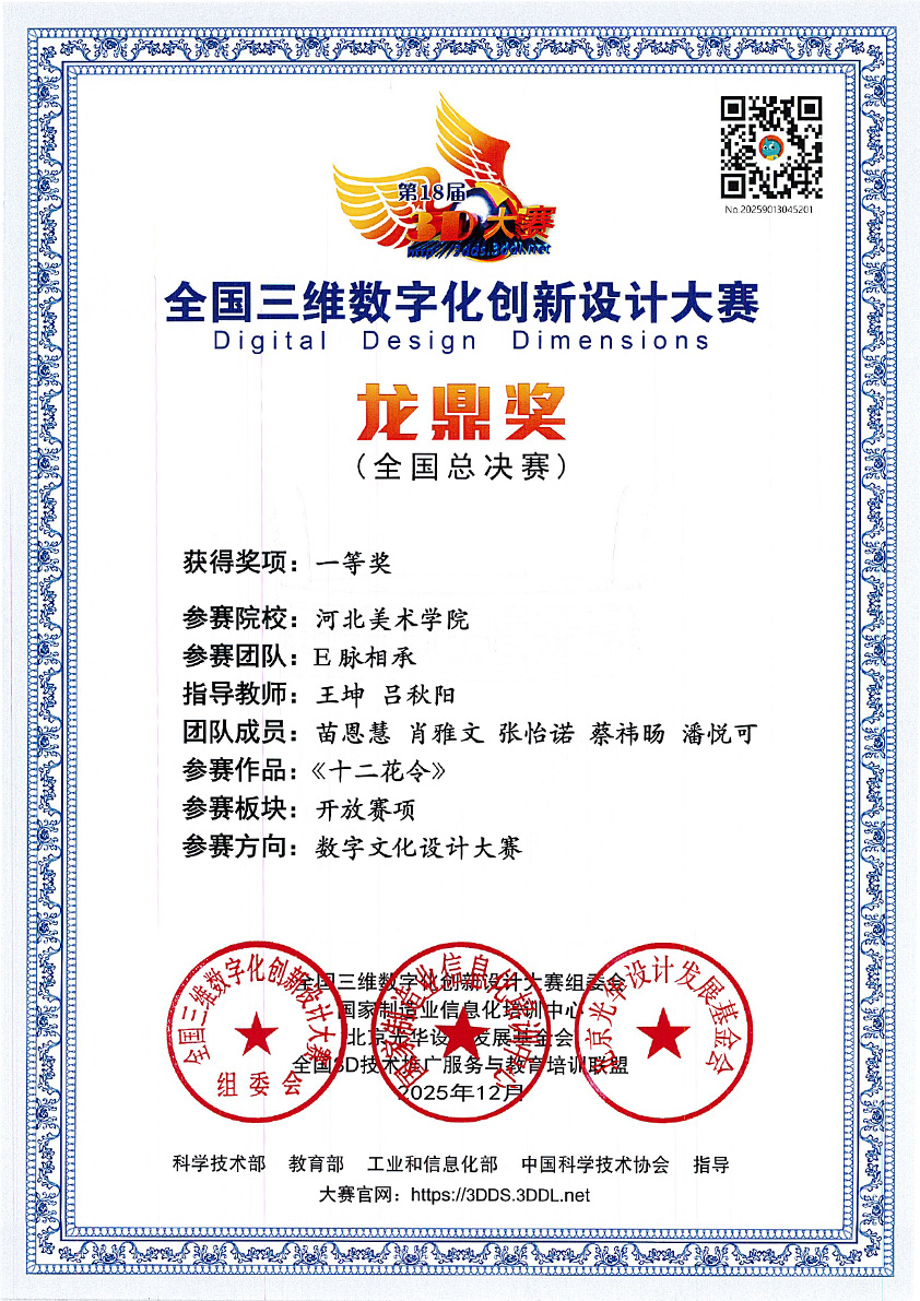 12月21日,2025年第18届全国三维数字化创新设计大赛全国总决赛在北京建筑大学(西城校区)圆满落幕。beat365在线体育官网登录入口未来智能艺术学院学生团队(成员:苗恩慧、肖雅文、张怡诺、蔡祎旸、潘悦可)在指导教师王坤、吕秋阳的带领下,凭借作品《十二花令》在本次大赛中表现出色,先后荣获河北赛区特等奖(数字文化设计方向)、全国总决赛一等奖(数字文化设计方向),充分展现了河美学子在数字艺术与三维技术融合领域的创新探索与实践能力。