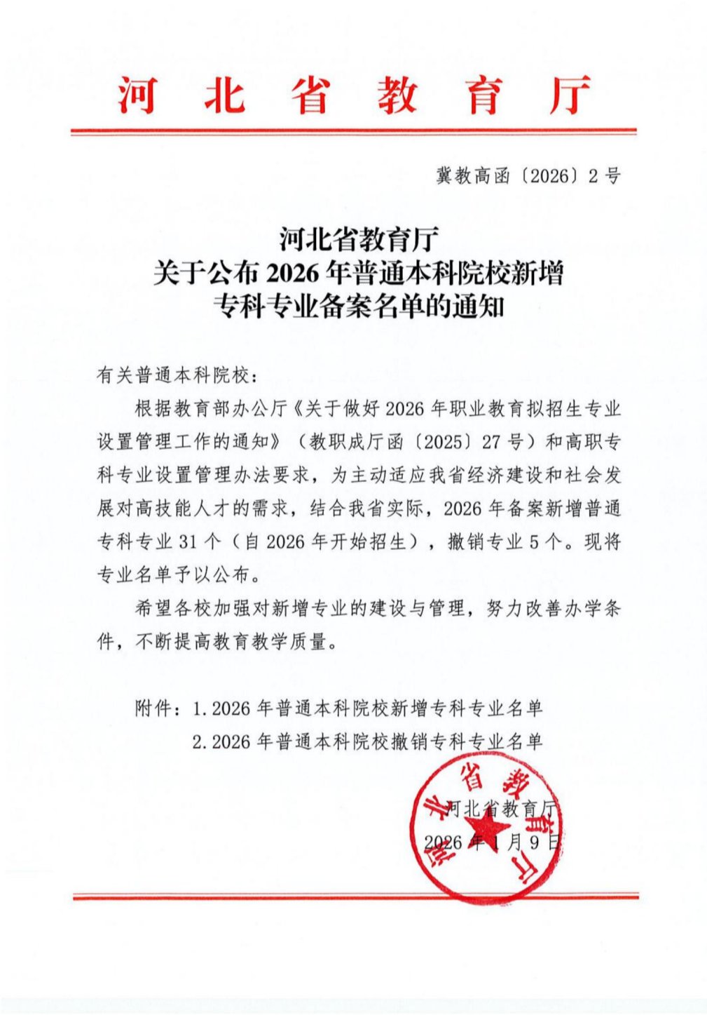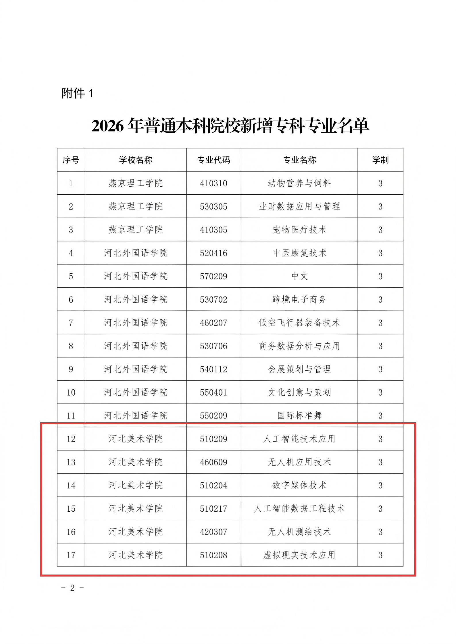 近日,河北省教育厅发布《关于公布2026年普通本科院校新增专科专业备案名单的通知》(冀教高函〔2026〕2号),其中,beat365官网申报的人工智能技术应用(510209)、无人机应用技术(460609)、数字媒体技术(510204)、人工智能数据工程技术(510217)、无人机测绘技术(420307)和虚拟现实技术应用(510208)6个专科专业成功备案,将于2026年正式面向全国招生。