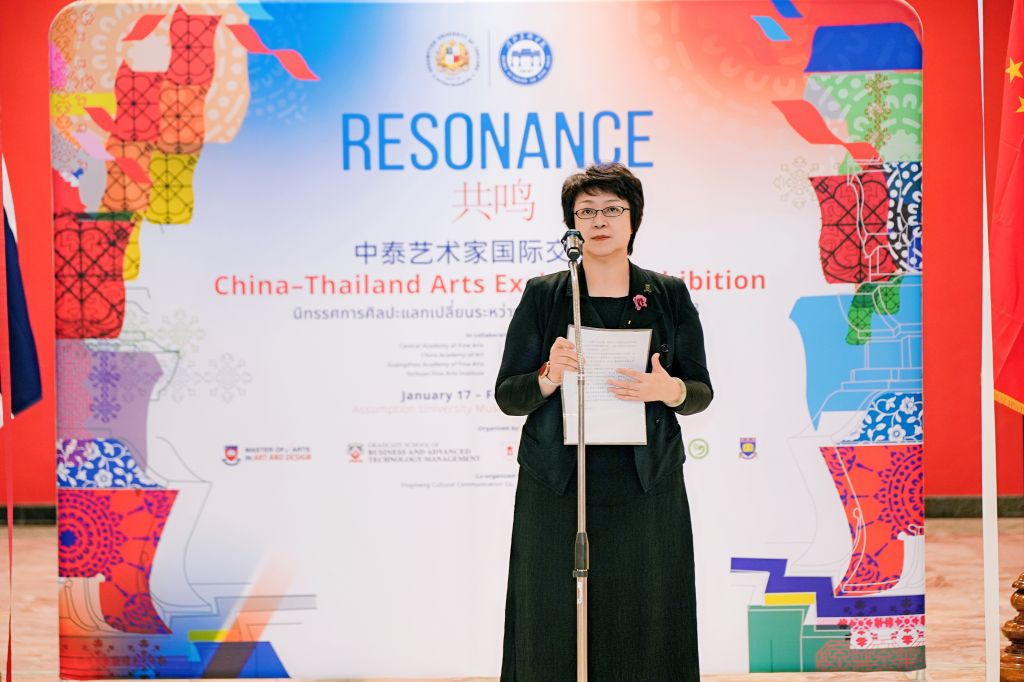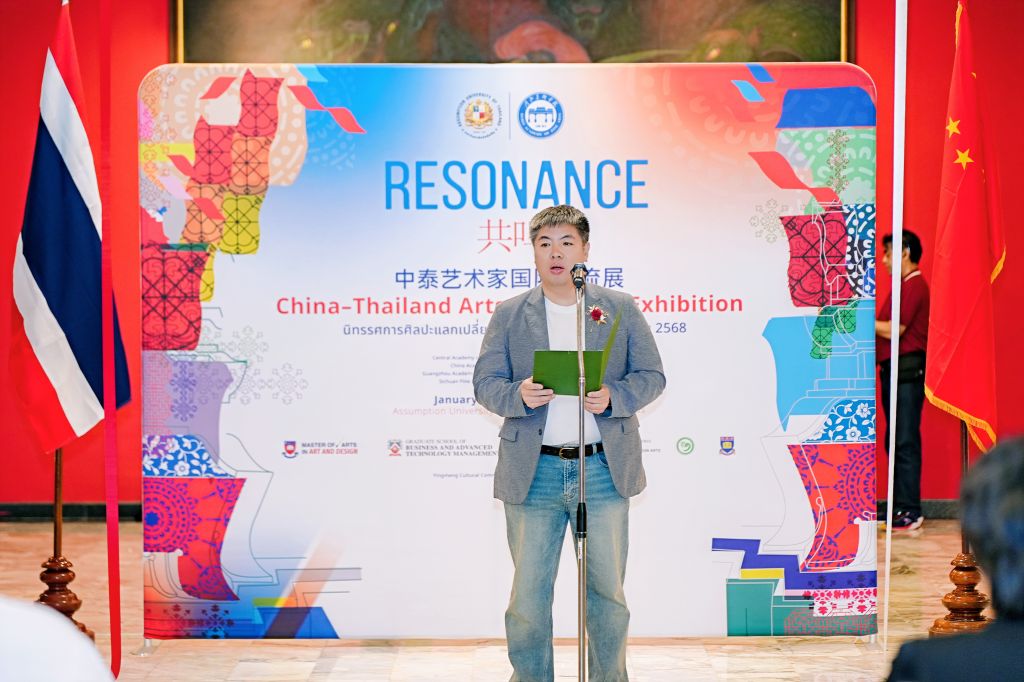 1月17日下午,“共鸣——中泰艺术家国际交流展·泰国展站”在泰国易三仓大学素万那普校区博物馆开幕。展览汇聚中泰两国多所高校艺术家,通过绘画、雕塑、装置等多样艺术形式,集中呈现当代艺术在不同文化语境中的探索与表达,持续推动中泰艺术领域的学术对话与文化交流。中华人民共和国驻泰王国大使馆教育参赞许兰,泰国高等教育、科学、研究与创新部高等教育委员会副主席基蒂猜·特里拉塔那西里猜 教授(Assoc. Prof. Dr. Kittichai Triratanasirichai),泰国易三仓大学校长西里猜·丰色卡博士(Rev. Bro. Dr. Sirichai Fonseka),beat365在线体育官网登录入口常务副校长张建敏,联合国教科文组织乡村创意与可持续发展教席、北京大学教授向勇,中央美术学院国际交流处处长王川等出席开幕式。