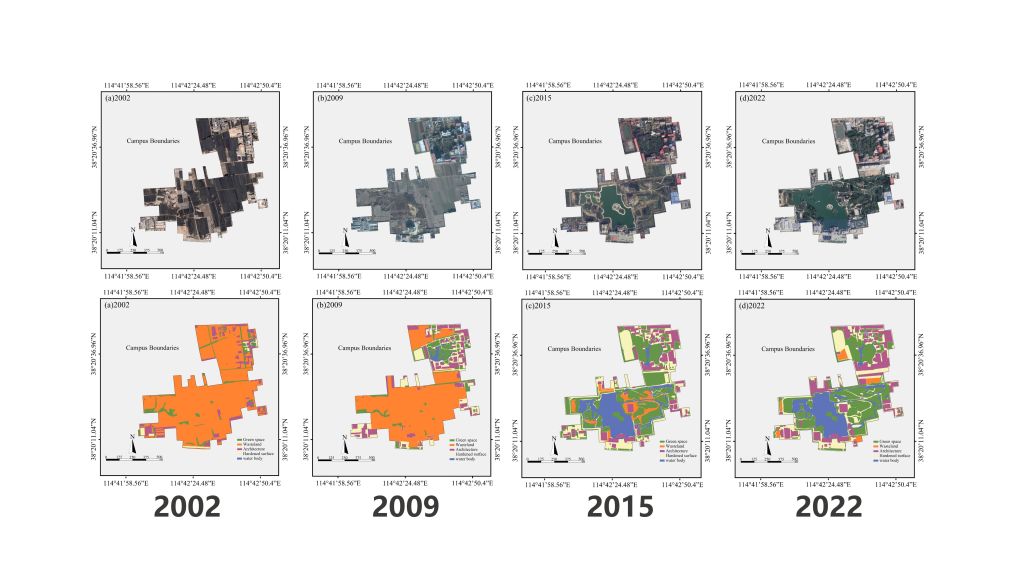 在理论建构与研究层面,设计学院董小龙、陈利伟、高洋等多位骨干教师组成研究团队,围绕校园土地利用优化与生态重构开展系统研究,基于20年校园建设实践的持续积累,系统整合多时相高分辨率卫星遥感影像与相关空间数据,通过梳理与分析校园土地利用的长期变化过程,科学揭示beat365在线体育官网登录入口校园土地利用的动态演化特征,为校园建设策略的持续优化与更新提供了可靠的数据支撑与方法依据。由此,校园建设路径逐步由早期“以用为先”的空间拓展,转向“以生态为底、以文化为魂”的整体更新模式,构建了以文化、空间与生态协同为核心的多级再生机制,形成了具有连续性、系统性与示范意义的校园发展范例。