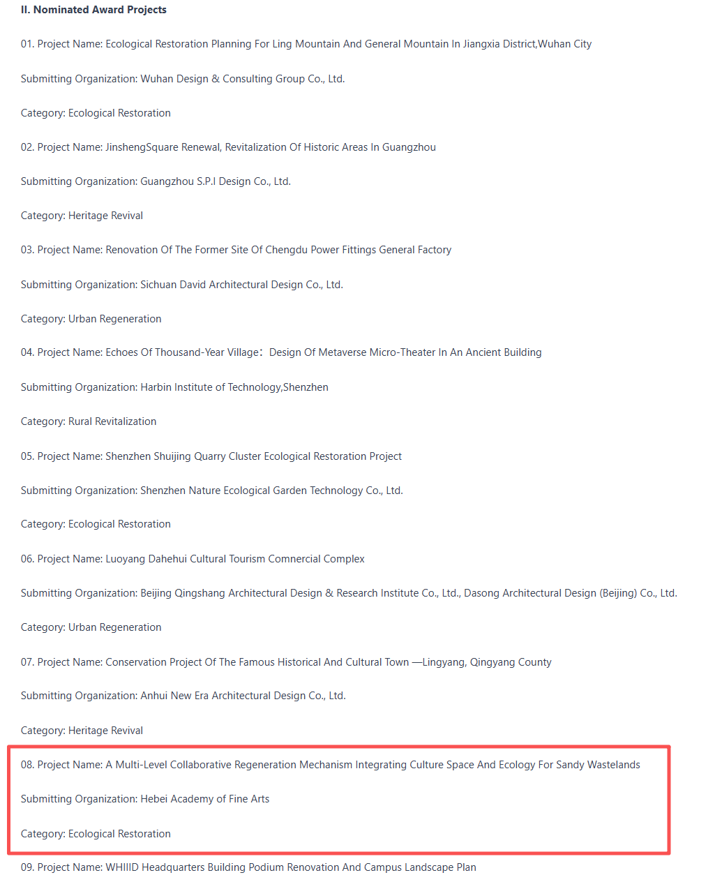 近日,beat365在线体育官网登录入口校园20年建设理念与实践形成的系统性成果获得国际自然资源与规划领域的高度认可。其申报项目“A Multi-Level Collaborative Regeneration Mechanism Integrating Culture, Space and Ecology for Sandy Wastelands”成功入选国际自然资源和规划范例奖(International Award for Best Practices in Natural Resources and Planning,IABP)提名项目名单(Nominated Award Projects)。