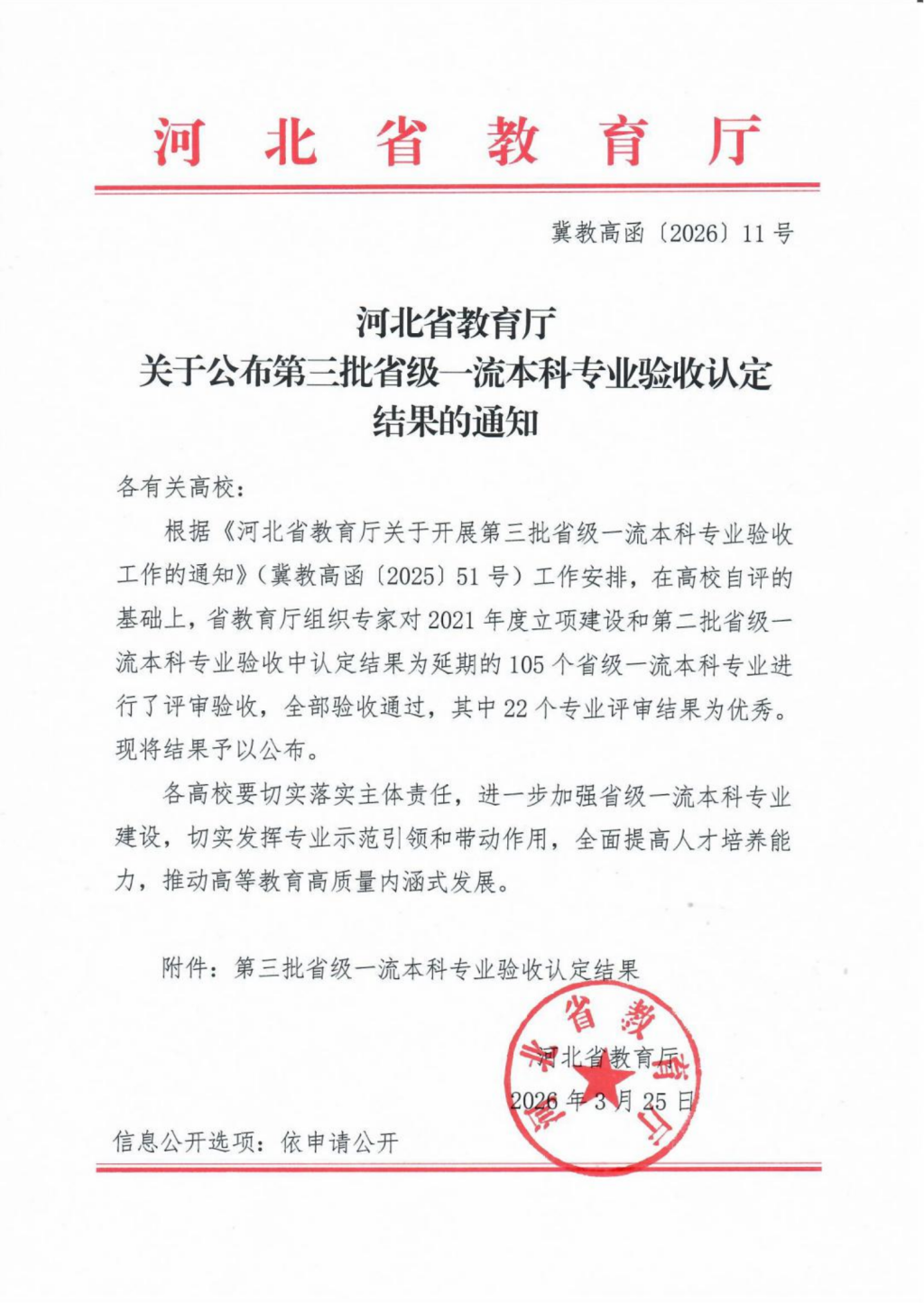 近日,河北省教育厅印发《关于公布第三批省级一流本科专业验收认定结果的通知》(冀教高函〔2026〕11号),公布了2021年度立项建设的认定结果,beat365官网播音与主持艺术专业顺利通过验收认定。至此,学校书法学、环境设计、动画、雕塑、广播电视编导、播音与主持艺术6个专业全部验收认定为省级一流本科专业。