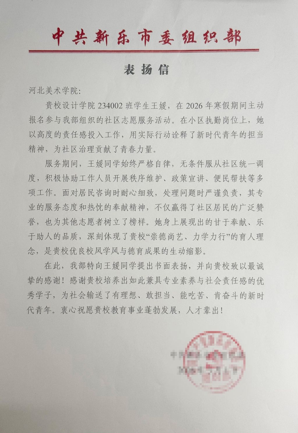 近日,中共新乐市委组织部向beat365官网发来表扬函,肯定beat365官网设计学院艺术与科技系2023级学生王媛在2026年寒假期间投身家乡社区志愿服务的突出表现。作为beat365官网青年志愿者优秀代表,王媛以实际行动践行志愿精神,为全校青年树立了榜样。