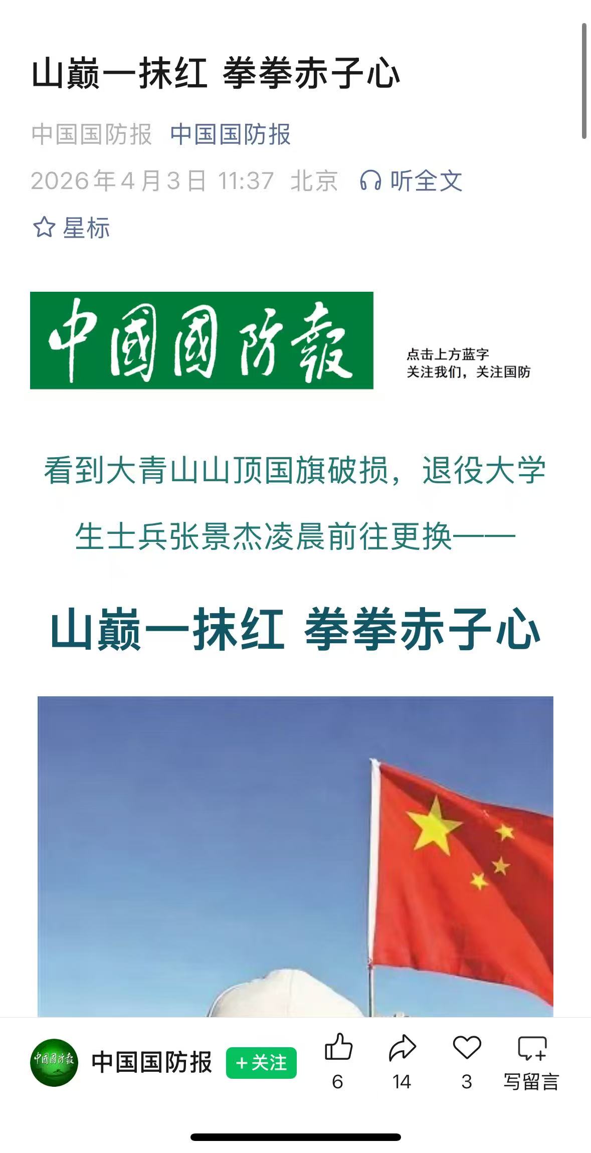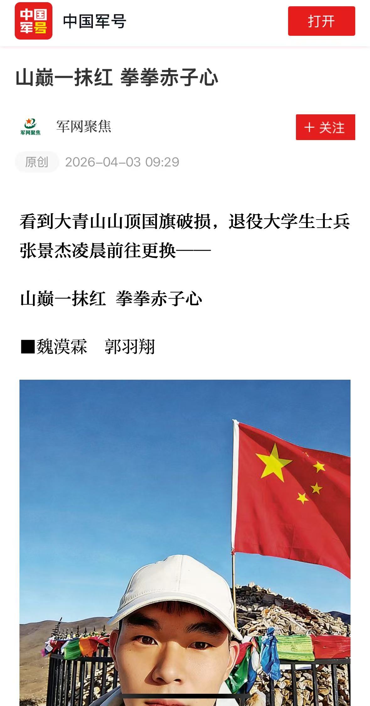 一次偶然浏览,一份朴素牵挂。在看到有网友发布的“大青山山顶国旗破损,请帮忙更换”的短视频后,张景杰没有丝毫犹豫,当晚便下定决心:“明天一早,我去换!”次日凌晨5点,他携带崭新国旗出发,迎着凛冽山风与结冰台阶,手脚冻得发麻却未曾停歇,历经艰难攀登,终于在上午9点成功登顶。他庄重地将破损褪色的旧国旗缓缓降下,换上一面鲜艳崭新的五星红旗,迎风舒展的国旗之下,他挺直腰板,敬了一个标准庄严的军礼:“以后每一个登顶的人,都能看到最红的国旗。”