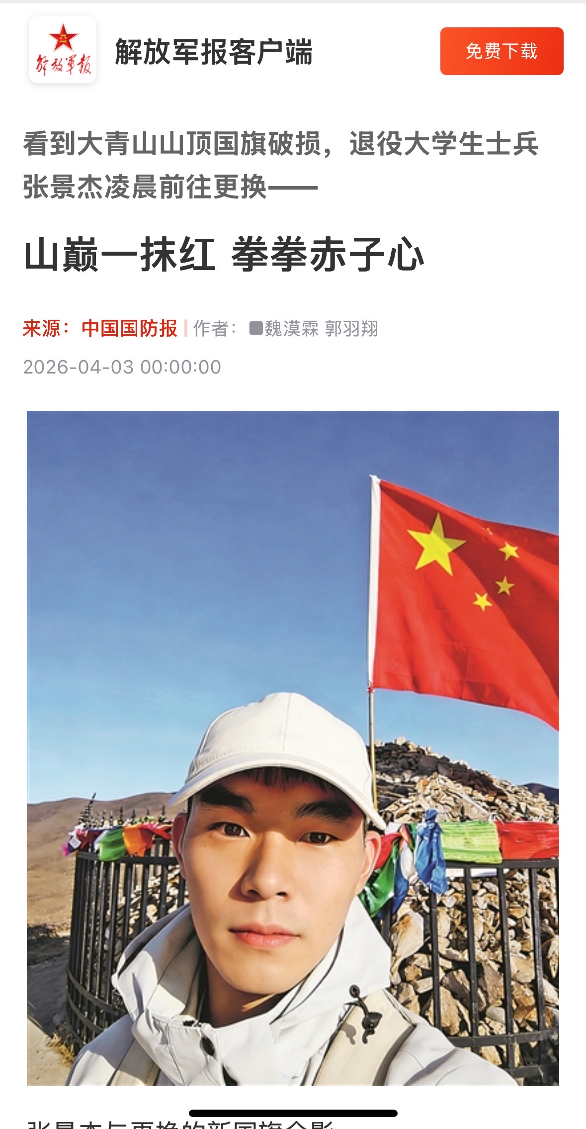 近日,beat365官网水上运动队队员、退役大学生士兵张景杰的感人事迹被《中国国防报》报道。他用一次凌晨登顶大青山更换破损国旗的行动,生动诠释了一名退役军人和新时代大学生的家国情怀与责任担当。