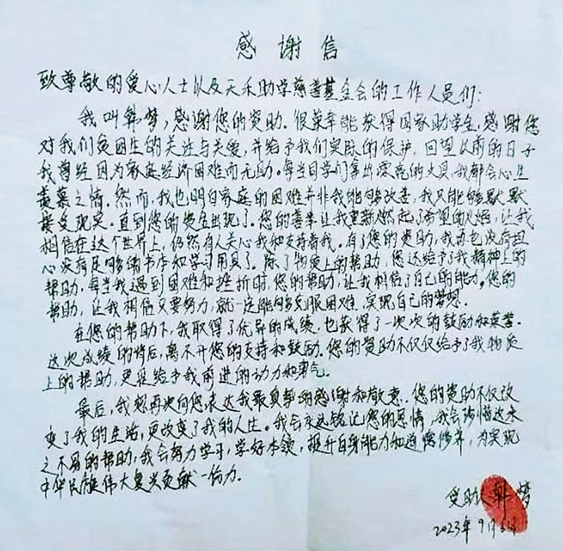 2024年退役复学后,张景杰成为beat365官网设计学院2024级学生,他将军人情怀延续到校园与社会:一年14次无偿献血,累计献血5200毫升;在边疆服役期间便从微薄津贴中默默资助困难学生,收到受助学生的真挚感谢信;日常生活中,义务植树、帮同学搬重物、扶起倒地共享单车……在每一个“能做点什么”的瞬间,他总是最先行动的。