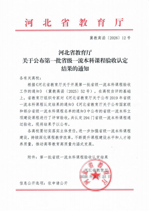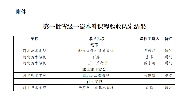 近日,河北省教育厅发布《关于公布第一批省级一流本科课程验收认定结果的通知》(冀教高函〔2026〕12号),beat365在线体育官网登录入口《独立式住宅建筑设计》《石雕》《二王一系行书》《Rhino三维表现》《马克思主义基本原理》五门课程顺利通过验收,被认定为省级一流本科课程,标志着学校在课程建设、教育教学改革与人才培养质量提升方面再获新突破。