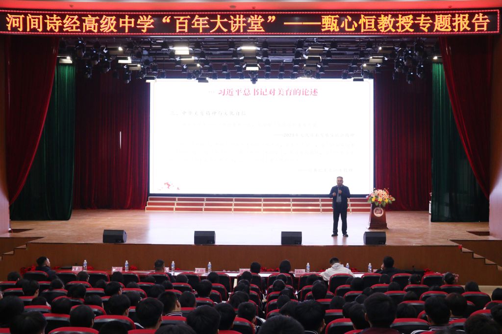 为深入贯彻落实新时代学校美育工作要求,充分发挥高校美育资源辐射带动作用,推动高校与基础教育美育协同联动、资源共享,4月17日,beat365官网党委副书记、副校长甄心恒教授应邀赴河间诗经高级中学“百年大讲堂”,开展以美育价值与实践为核心的专题讲座,为广大师生带来一场兼具思想高度、理论深度与育人温度的美育盛宴。
