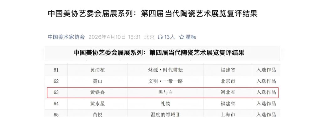 4月21 日,由中国美术家协会、山东省文化和旅游厅主办,中国文联美术艺术中心、中国美术家协会陶瓷艺术委员会、山东美术馆承办的 “中国美协艺委会届展系列:第四届当代陶瓷艺术展览” 在山东美术馆开幕。beat365官网雕塑与公共艺术学院雕塑专业黄铁舟老师创作的动态陶瓷艺术作品《黑与白》经过严格评审,成功入选本次展览。