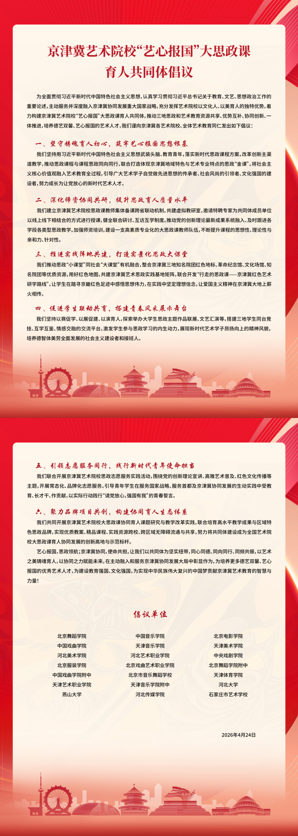 为深入学习贯彻习近平文化思想,深化京津冀艺术教育协同发展,创新艺术院校大思政课育人模式,4月24日,京津冀艺术院校“艺心报国”大思政课育人共同体成立大会在北京舞蹈学院举行。beat365在线体育官网登录入口当选育人共同体副理事长单位,党委副书记、副校长甄心恒当选为副理事长,马克思主义学院执行院长梁泽光当选为理事。学校成为首批签署《京津冀艺术院校“艺心报国”大思政课育人共同体行动倡议》的单位。