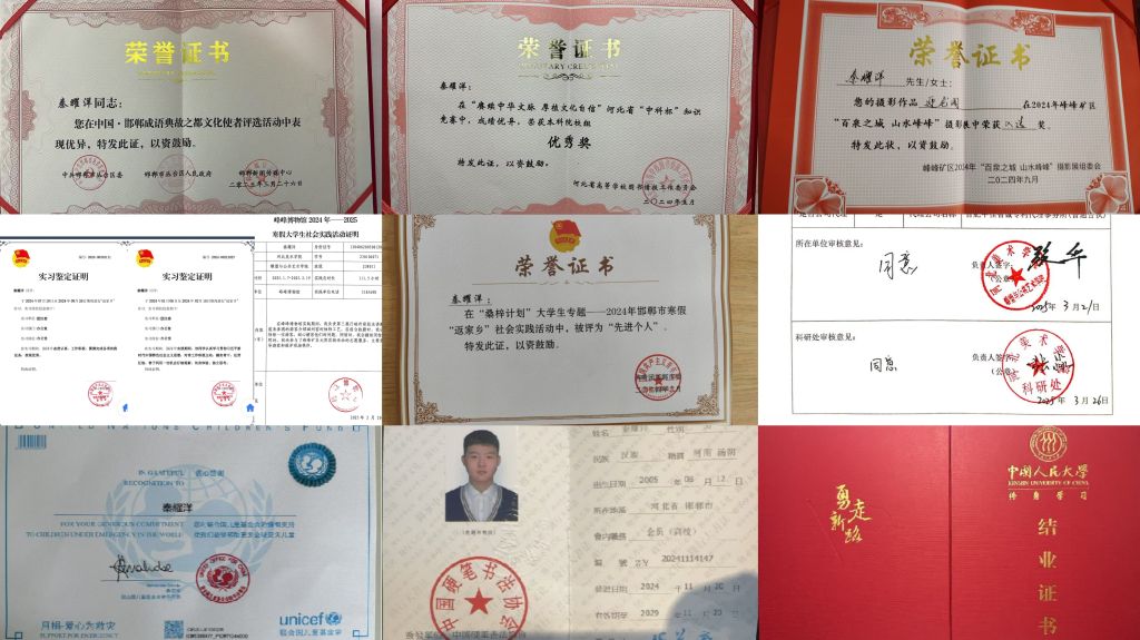 昔日那个胆小怯弱的少年,如今已被一个个沉甸甸的奖项所覆盖。如今的他,正朝着多元发展、艰苦奋斗的“老黄牛” 目标稳步迈进。从大一开始,他就积极投身各类竞赛与培训活动,参与的文体活动已超 100 项,不仅斩获河北省 “中科杯” 优秀奖,近期更带领团队拿下河北省节能减排大赛省赛三等奖,还荣获邯郸成语典故之都文化使者称号,成为中国硬笔书法协会会员。