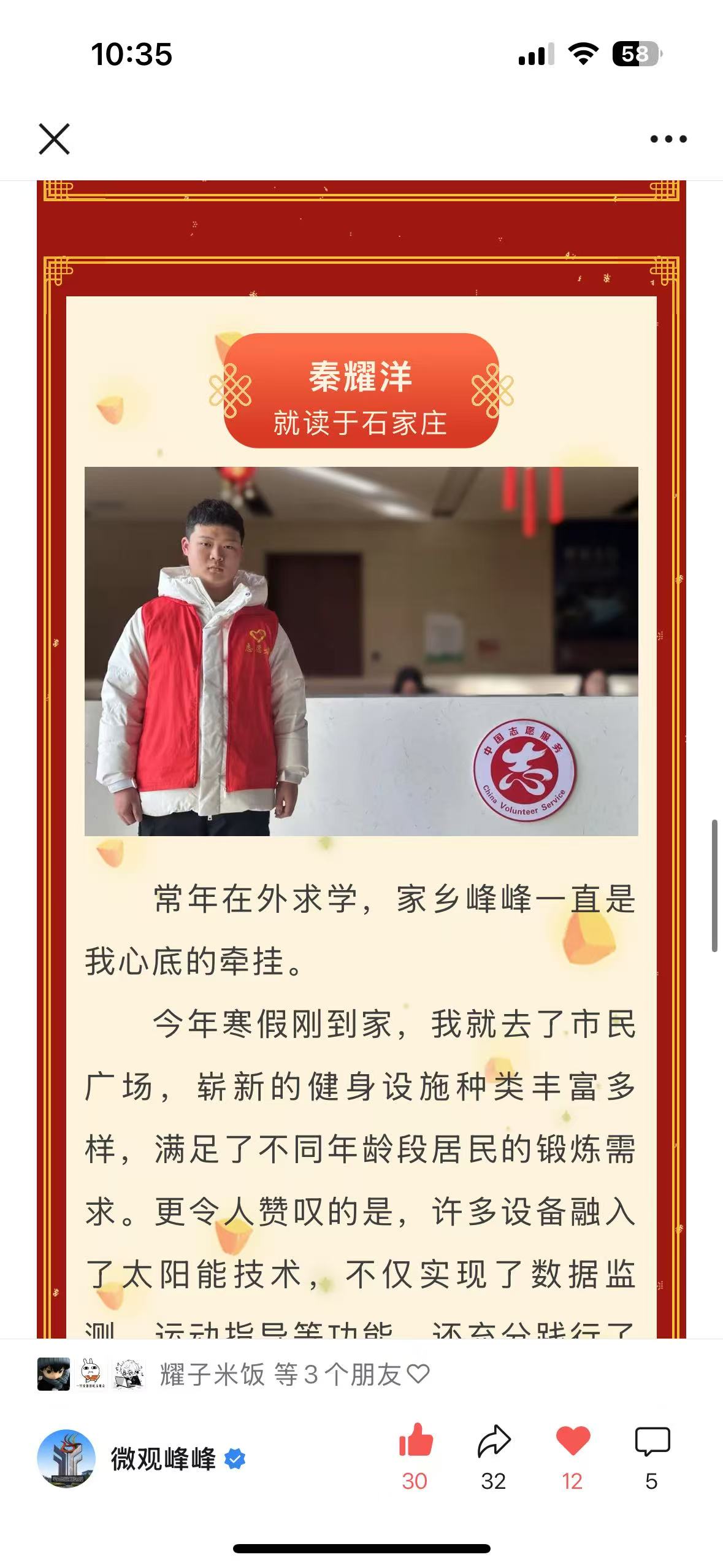 2025年2月,在“大学生返家乡”志愿服务活动中,秦耀洋获一位老将军亲授中国共产党党徽。老将军嘱其秉持全心全意为人民服务宗旨,积极向党组织靠拢,并以习近平总书记所倡导的“三牛精神”相勉,激励他为中华民族伟大复兴而奋斗。