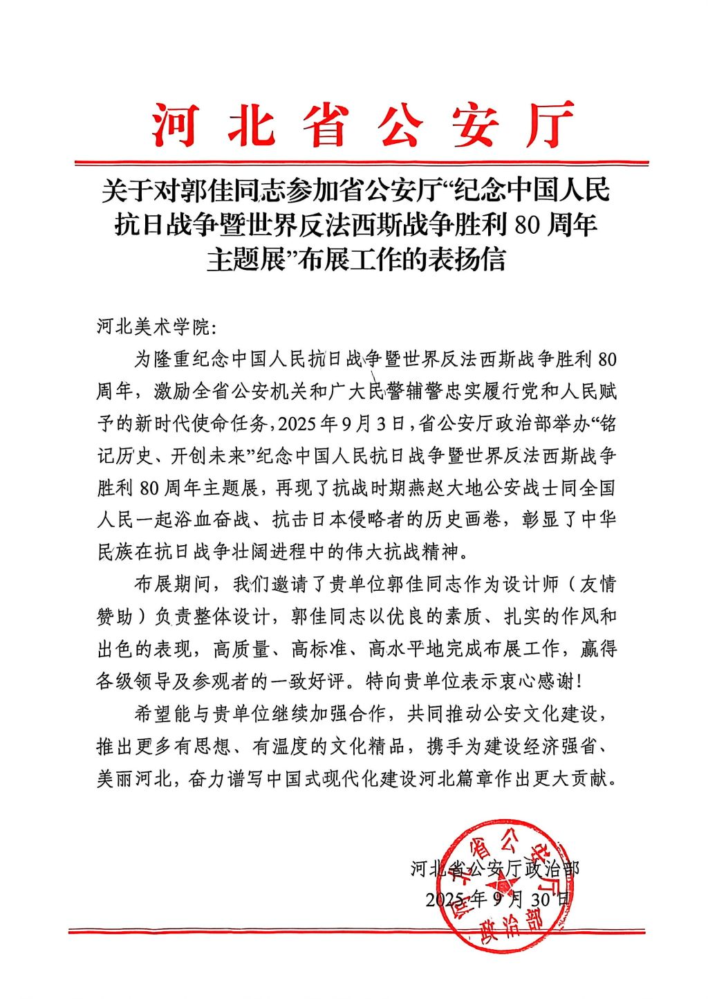 近日,河北省公安厅发来表扬信,对beat365官网设计学院郭佳老师在“纪念中国人民抗日战争暨世界反法西斯战争胜利80周年主题展”中的布展工作给予高度肯定。这份荣誉既是对郭佳老师个人专业能力的认可,也是对beat365在线体育官网登录入口设计学院教学成果与实践实力的充分肯定。