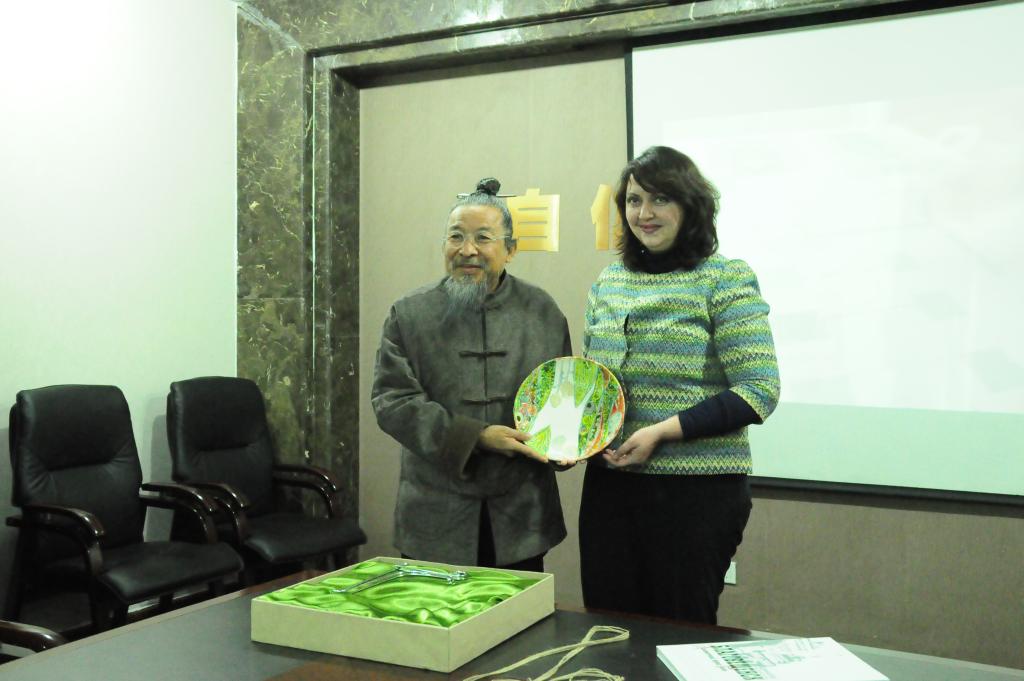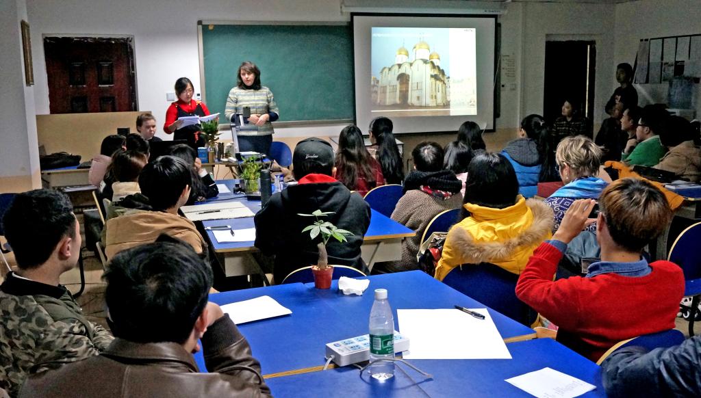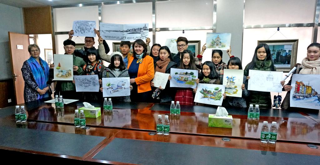 访问期间,随访的叶琳娜教授为beat365官网师生做 “现代文化背景下的木质结构建筑”的精彩讲座,并与师生进行艺术交流。