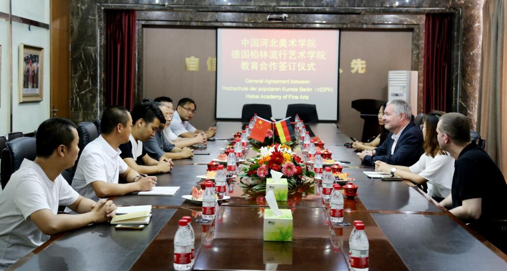 2017年7月9日,德国柏林流行艺术学院WUENSCH院长、MARTINADAM教授一行来校,与甄忠义校长签订建立友好合作院校协议书。副校长张子言、甄心恒、甄墨,国际教育学院院长兰新成参加欢迎仪式。