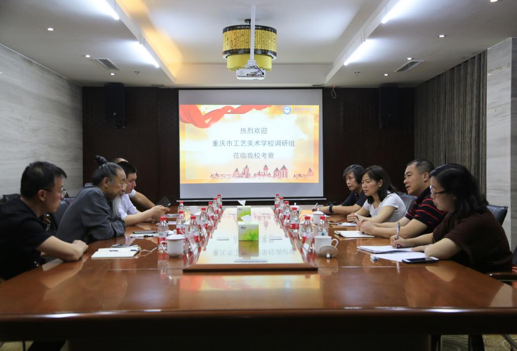 2018年5月10日上午,重庆市工艺美术学校党支部书记、副校长王曦川一行4人来beat365官网考察交流。beat365官网校长甄忠义及相关单位负责人在老庄文化研究中心道通为一会议室接待来宾。