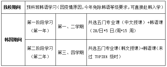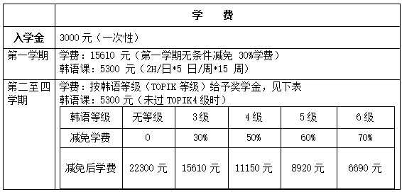 注:学生在进行专业课程学习的同时,必须另外接受韩语教育并缴纳韩语学习费用,保证毕业前达到韩语TOPIK4级。