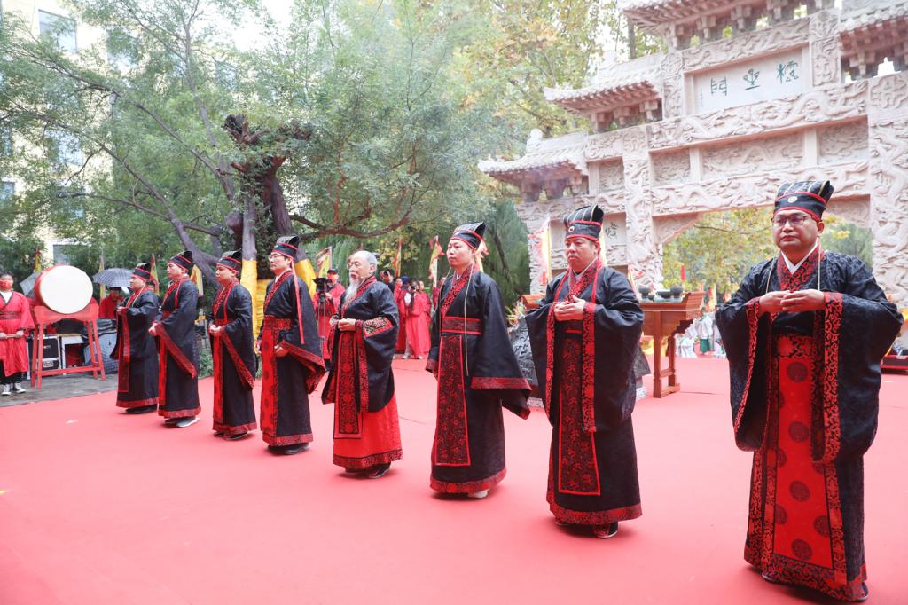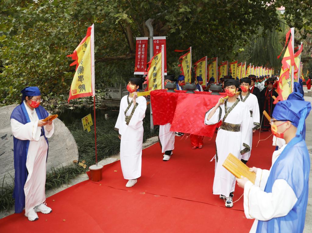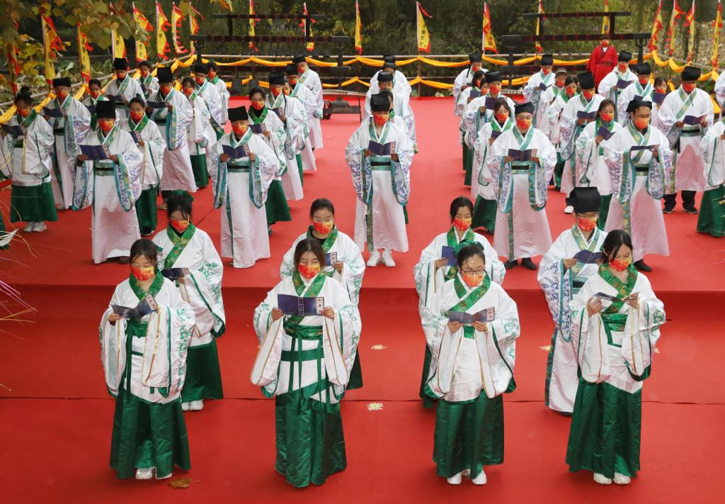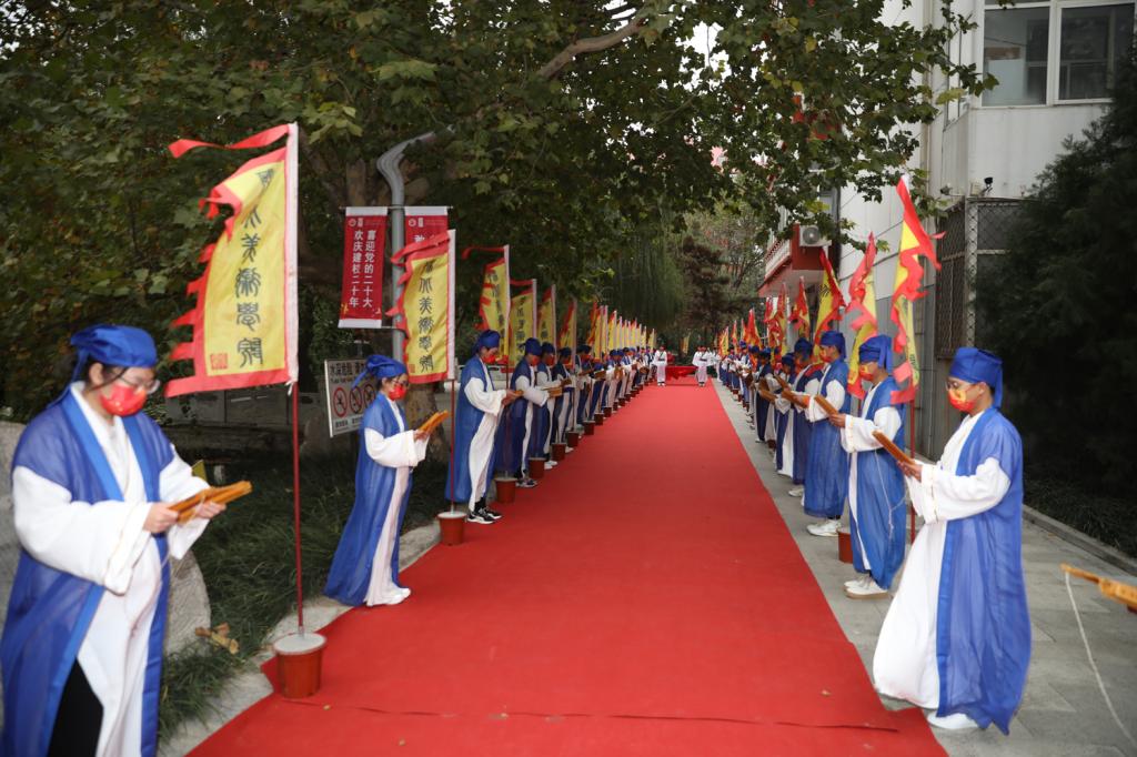 校长甄忠义作为主祭人,行汉礼,敬献帛爵,恭读诰文,敬告圣人。党委书记裴红彬、教师张显果分别进行亚献礼、终献礼。随后,众宾行礼、众人高诵《孔子赞》、行三拜之礼……