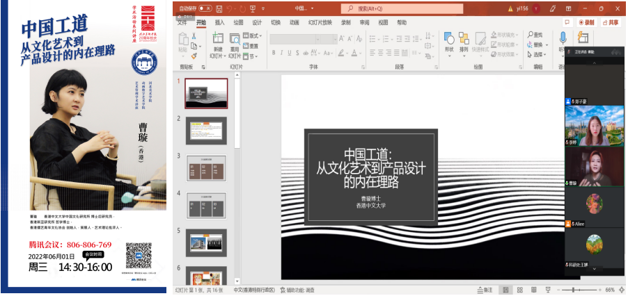 2022年6月1日,香港中文大学中国文化研究所博士后研究员曹璇博士应邀在线讲授“中国工道:从文化艺术到产品设计的内在理路”为主题的学术讲座。动画数字艺术学院艺术管理教研室及美术基础教研室教师参加了本次讲座,讲座由郑子豪老师主持。曹璇博士详细梳理了文化产业从经验到产品转化到品牌再到文化赋能的内在逻辑;结合包豪斯艺术的发展,解释了现代社会设计思潮的缘起;就文化艺术...